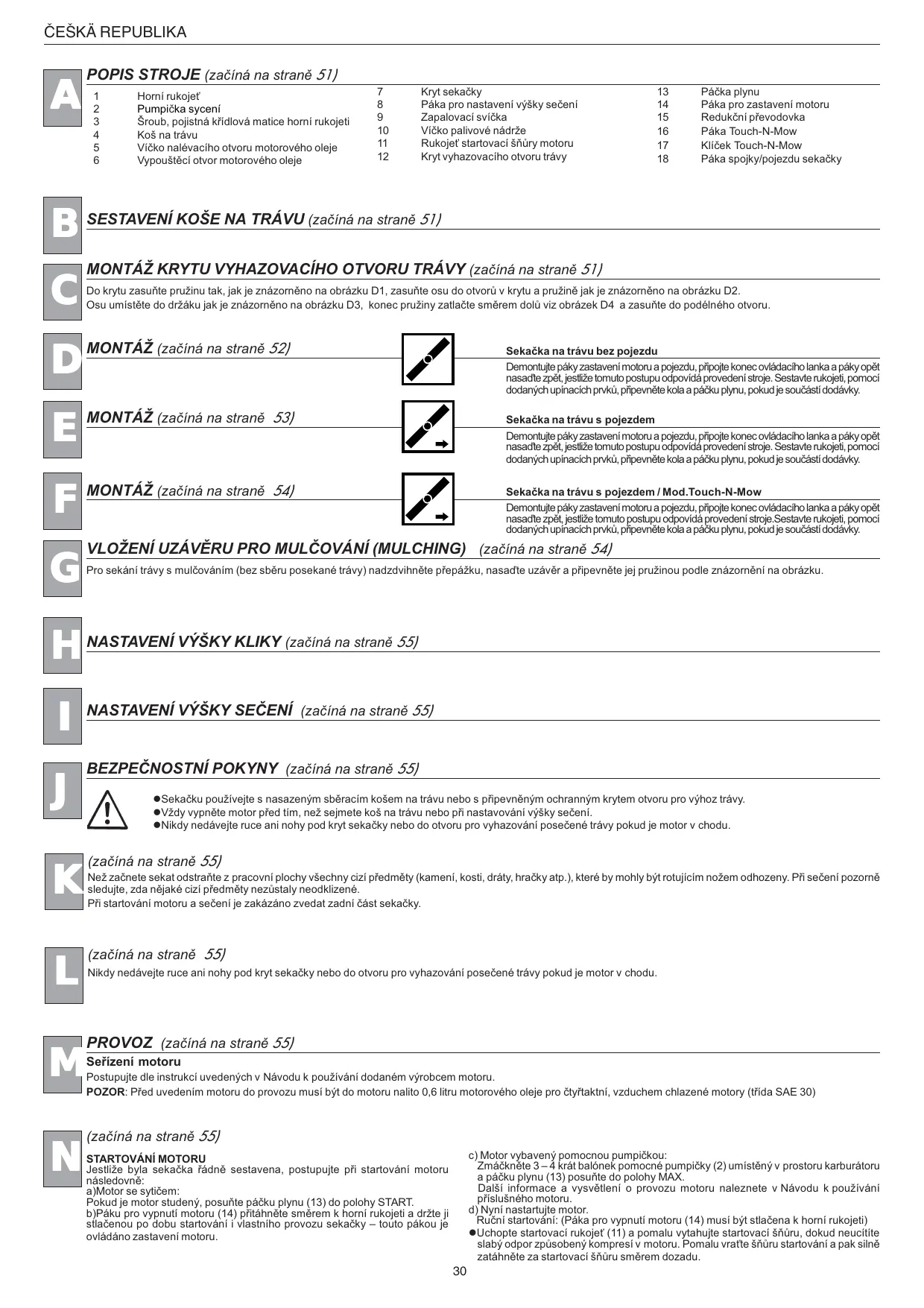 Sekaèka na trávu bez pojezdu Demontujte páky zastavení motoru a pojezdu, pøipojte konec ovládacího lanka a páky opìt nasaïte zpìt, jestlie tomuto postupu odpovídá provedení stroje. Sestavte rukojeti, pomocí dodaných upínacích prvkù, pøipevnìte kola a páèku plynu, pokud je souèástí dodávky. VLOENÍ UZÁVÌRU PRO MULÈOVÁNÍ (MULCHING) (zaèíná na stranì 54) Pro sekání trávy s mulèováním (bez sbìru posekané trávy) nadzdvihnìte pøepáku, nasaïte uzávìr a pøipevnìte jej pruinou podle znázornìní na obrázku. NASTAVENÍ VÝKY KLIKY (zaèíná na stranì 55) NASTAVENÍ VÝKY SEÈENÍ (zaèíná na stranì 55) BEZPEÈNOSTNÍ POKYNY (zaèíná na stranì 55) lSekaèku pouívejte s nasazeným sbìracím koem na trávu nebo s pøipevnìným ochranným krytem otvoru pro výhoz trávy. lVdy vypnìte motor pøed tím, ne sejmete ko na trávu nebo pøi nastavování výky seèení. lNikdy nedávejte ruce ani nohy pod kryt sekaèky nebo do otvoru pro vyhazování poseèené trávy pokud je motor v chodu. (zaèíná na stranì 55) Ne zaènete sekat odstraòte z pracovní plochy vechny cizí pøedmìty (kamení, kosti, dráty, hraèky atp.), které by mohly být rotujícím noem odhozeny. Pøi seèení pozornì sledujte, zda nìjaké cizí pøedmìty nezùstaly neodklizené. Pøi startování motoru a seèení je zakázáno zvedat zadní èást sekaèky. (zaèíná na stranì 55) Nikdy nedávejte ruce ani nohy pod kryt sekaèky nebo do otvoru pro vyhazování poseèené trávy pokud je motor v chodu. PROVOZ (zaèíná na stranì 55) Seøízení motoru Postupujte dle instrukcí uvedených v Návodu k pouívání dodaném výrobcem motoru. POZOR: Pøed uvedením motoru do provozu musí být do motoru nalito 0,6 litru motorového oleje pro ètyøtaktní, vzduchem chlazené motory (tøída SAE 30) (zaèíná na stranì 55) c) Motor vybavený pomocnou pumpièkou: Zmáèknìte 3 4 krát balónek pomocné pumpièky (2) umístìný v prostoru karburátoru a páèku plynu (13) posuòte do polohy MAX. Dalí informace a vysvìtlení o provozu motoru naleznete v Návodu k pouívání pøísluného motoru. d) Nyní nastartujte motor. Ruèní startování: (Páka pro vypnutí motoru (14) musí být stlaèena k horní rukojeti) lUchopte startovací rukoje (11) a pomalu vytahujte startovací òùru, dokud neucítíte slabý odpor zpùsobený kompresí v motoru. Pomalu vrate òùru startování a pak silnì zatáhnìte za startovací òùru smìrem dozadu.