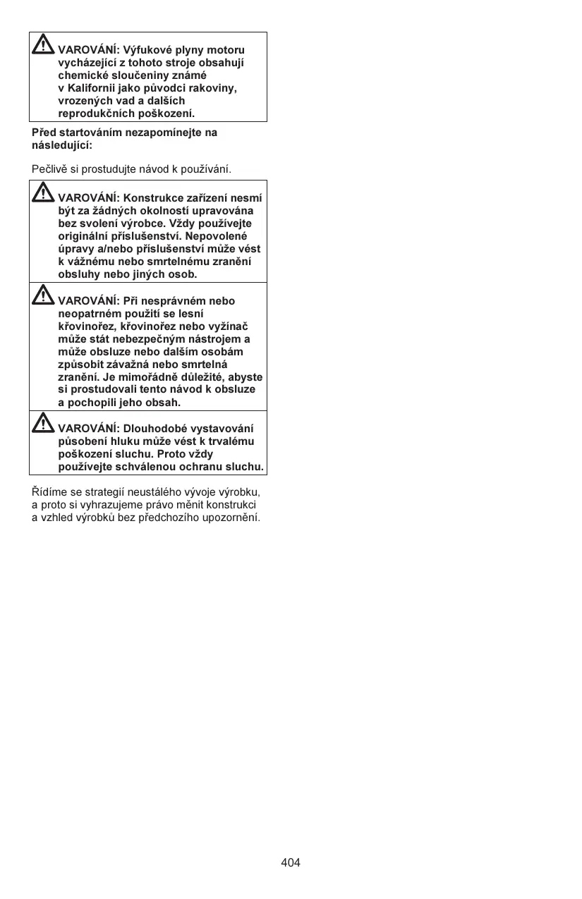 Contrôler les points suivants avant la mise en marche : Lisez attentivement le manuel d’utilisation. AVERTISSEMENT : Ne jamais modifier sous aucun prétexte la machine sans l’autorisation du fabricant. N’utiliser que des accessoires et des pièces d’origine. Des modifications nonautorisées et l’emploi d’accessoires non-homologués peuvent provoquer des accidents graves et même mortels, à l’utilisateur ou d’autres personnes. AVERTISSEMENT : Utilisés de manière négligente ou erronée, les scies d'éclaircissement et les coupe-herbes peuvent devenir des outils dangereux pouvant occasionner des blessures très graves, voire mortelles à l’utilisateur ou à d’autres personnes présentes. Il est très important de lire attentivement et de bien assimiler le contenu de ce manuel de l'opérateur. AVERTISSEMENT : Une exposition prolongée au bruit risque de causer des lésions auditives permanentes. Toujours utiliser des protecteurs d'oreilles agréés. Nous travaillons continuellement au développement de ses produits et nous réservons le droit d’en modifier, entre autres, la conception et l’aspect sans préavis.