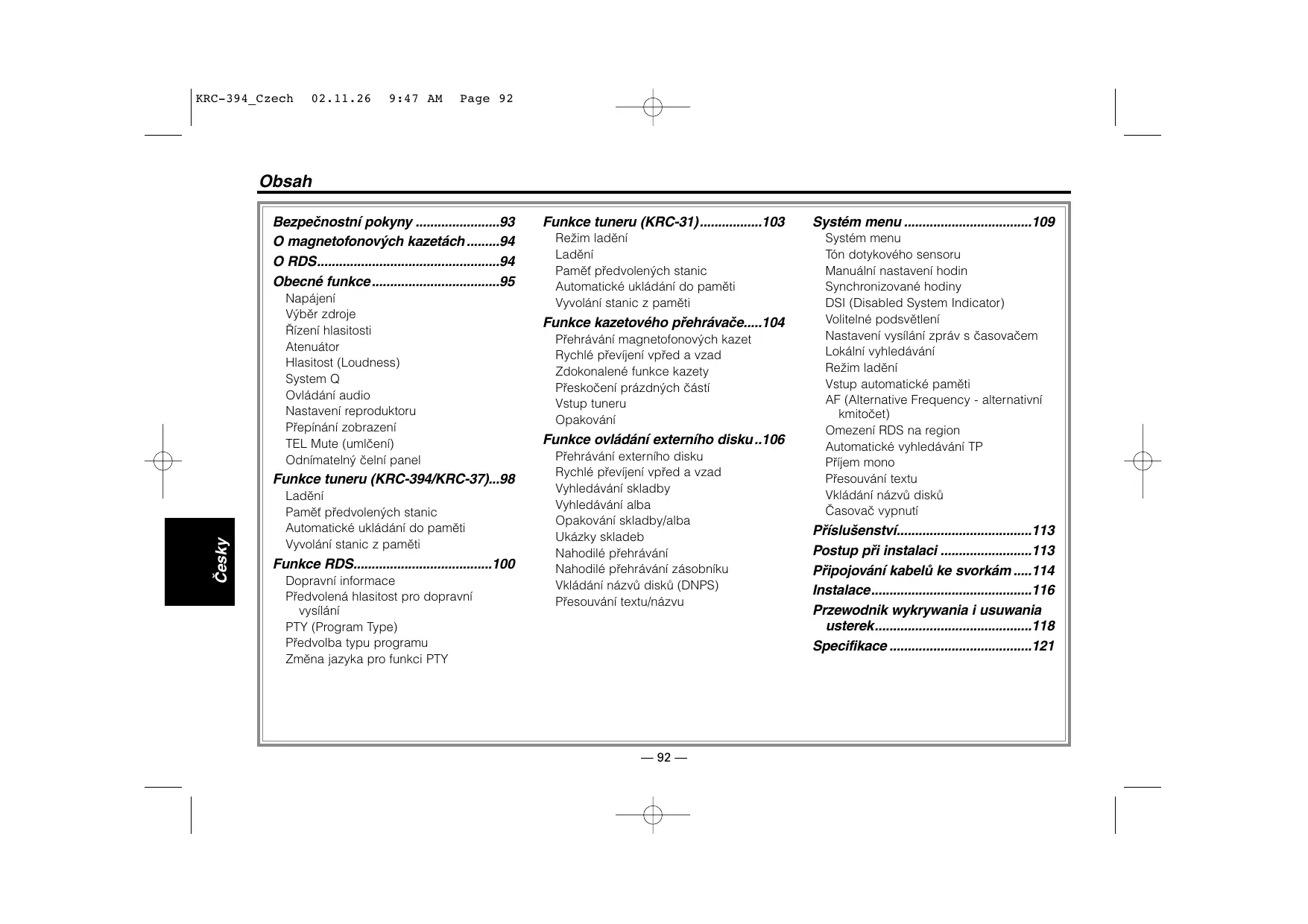 Vÿstup tuner ? Pfijem rozhlasu je Spatnÿ. # _ Anténa na vozidie neni vysunuta. “_Anténu zcela vysuñte # _ Ridici kabel pro anténu neni zapojen #_ Kabel pripoite sprâvné, fidte se podle éästi <Pripojoväni kabelü ke svorkäm> ? Neni nastavena hlasitost dopravniho vysiläni. # Prednastavené hlasitost vysiläni byla nizëi nez aktuäini hlasitost râdia. “x Je-li aktuäini hlasitost râdia vy8ëi nez prednastavené hlasitost, bude pouita tato aktuäinf hlasitost. ReZim disku ? Bez vstupu do reZimu ovlädäni externiho CD prehrävaëe se zobrazuje "AUX". #_ O-N je prepnut do polohy "O* «_Prepinaë nastavte do polohy "N° Je pripojen nepodporovanÿ ménié diskü «x Pripojte ménié diskü, kierÿ je padporovän {str. 93) ? Non reprodukovän poZadovanÿ disk, ale jinÿ. W_ Zadanÿ disk je velmi zneëiëtèn «Disk vyüistète ReZim magnetofonové kazety ? Nelze vyjmout kazetu. # Düvodem je, Ze od vypnuti zapaloväni vozidla uplynulo vice nez 10 minut #_ Kazetu je mono vyimout pouze bëhem 10 minut po vypnuti zapaloväni Jestlie uplynulo vice ne 10 minut, zapnète zapaloväni a stisknète tlaëitko vyimuti (Eject): ? Funkce zdokonaleného prehräväni kazety a opakovaného prehräväni nefunguji sprävnè. v Mezera mezi jednotlivÿmi skladbami nent postfehnutelné, proto?e je pris krätkä “_Zachovejte mezi skladbami nejménë étyvterinovou mezeru 4 Mezera mezi jednotlivÿmi skladbami neni rozeznatelnä, protoze je tam priliénÿ Sum ur Omezte Sum mezi skladbami ? Funkce rychlé preskoëeni mezer nefunguje. #_ Jeliko? je hladina Sumu prilié vysok, nejsou nenahrané éésti rozeznatelné 1 Omezte Sum mezi skladbami ? Funkce rychlé preskoëeni mezer na nahranÿch éästech. #_ Üroveñ nahräväni je piilié nizkä a nahrané éästi nejsou rozeznatelné. «_Vypnète funkci rychlé preskoëeni mezer. Zadanÿ disk je vloen obrâcenë «Disk vloëte potiétènou stranou vzhüru # Disk je vlozen do jiné zäsuvky, nez zadané «_Vyimëte zäsobnik s disky a zkontrolujte umisténi disku Disk je poëkräbän: «æ_Zkuste jinÿ disk. ‘? Zadané skladba se nereprodukuje. # Je zapnuta funkce nähodné reprodukce nebo nâhodné reprodukce Zäsobniku. u_Funkci néhodné reprodukce vypnëte ? Funkce opakoväni skladby, vyhledäväni skladby, nähodnÿ vÿbèr skladeb a néhodnÿ vÿbèr skladeb na véech discich jsou spouëtény automaticky. # _ Nastaveni neni zruëeno. ur Tyto funkce züstävai! zapnuté dokud se nevypnou ruënë nebo dokud se nevyjme disk, a to i v prpadë Ze se jednotka vypne nebo zvoli jinÿ zdroj vstupniho signälu: ? Nelze prehrät CD-R nebo CD-RW. _U CD-R/CD-RW neprobëhl proces finalizace. u_Provedie proces finalizace na CD rekordéru V7 Pro prehräni CD-R/CD-RW je pouzit nekompatibiin mënié CD. u_Pro prehräni pouzilte ménié CD kompatibiini s CD-R/CD-RW. ? Nelze zvolit vyhledäväni skladeb. #_ Prvni a posledni skladba alba « Vyhledäväni skladeb nelze pouit ve zpètném smèru pro wyhledäni pryni skladby a ve smëru vpred pro vyhledäni posledni skladby, — 119—