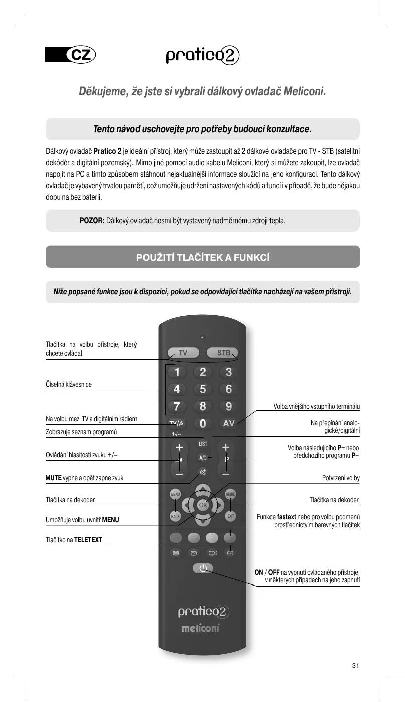 Děkujeme, že jste si vybrali dálkový ovladač Meliconi. Tento návod uschovejte pro potřeby budoucí konzultace. Dálkový ovladač Pratico 2 je ideální přístroj, který může zastoupit až 2 dálkové ovladače pro TV - STB (satelitní dekódér a digitální pozemský). Mimo jiné pomocí audio kabelu Meliconi, který si můžete zakoupit, lze ovladač napojit na PC a tímto způsobem stáhnout nejaktuálnější informace sloužící na jeho konfiguraci. Tento dálkový ovladač je vybavený trvalou pamětí, což umožňuje udržení nastavených kódů a funcí i v případě, že bude nějakou dobu na bez baterií. POZOR: Dálkový ovladač nesmí být vystavený nadměrnému zdroji tepla.