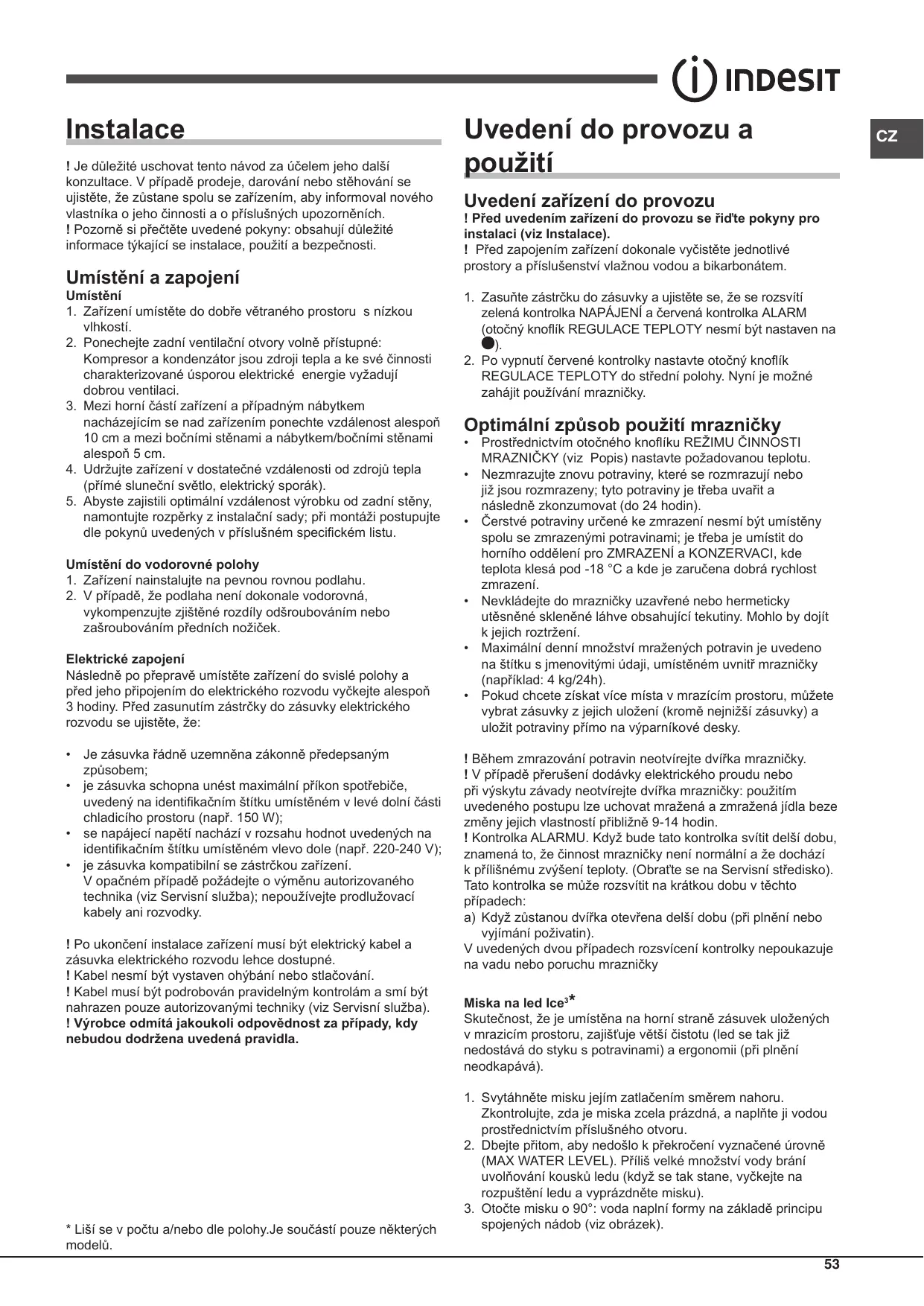 Umístění 1. Zařízení umístěte do dobře větraného prostoru s nízkou vlhkostí. 2. Ponechejte zadní ventilační otvory volně přístupné: Kompresor a kondenzátor jsou zdroji tepla a ke své činnosti charakterizované úsporou elektrické energie vyžadují dobrou ventilaci. 3. Mezi horní částí zařízení a případným nábytkem nacházejícím se nad zařízením ponechte vzdálenost alespoň 10 cm a mezi bočními stěnami a nábytkem/bočními stěnami alespoň 5 cm. 4. Udržujte zařízení v dostatečné vzdálenosti od zdrojů tepla (přímé sluneční světlo, elektrický sporák). 5. Abyste zajistili optimální vzdálenost výrobku od zadní stěny, namontujte rozpěrky z instalační sady; při montáži postupujte dle pokynů uvedených v příslušném specifickém listu. Umístění do vodorovné polohy 1. Zařízení nainstalujte na pevnou rovnou podlahu. 2. V případě, že podlaha není dokonale vodorovná, vykompenzujte zjištěné rozdíly odšroubováním nebo zašroubováním předních nožiček. Elektrické zapojení Následně po přepravě umístěte zařízení do svislé polohy a před jeho připojením do elektrického rozvodu vyčkejte alespoň 3 hodiny. Před zasunutím zástrčky do zásuvky elektrického rozvodu se ujistěte, že: • Je zásuvka řádně uzemněna zákonně předepsaným způsobem; • je zásuvka schopna unést maximální příkon spotřebiče, uvedený na identifikačním štítku umístěném v levé dolní části chladicího prostoru (např. 150 W); • se napájecí napětí nachází v rozsahu hodnot uvedených na identifikačním štítku umístěném vlevo dole (např. 220-240 V); • je zásuvka kompatibilní se zástrčkou zařízení. V opačném případě požádejte o výměnu autorizovaného technika (viz Servisní služba); nepoužívejte prodlužovací kabely ani rozvodky. ! Po ukončení instalace zařízení musí být elektrický kabel a zásuvka elektrického rozvodu lehce dostupné. ! Kabel nesmí být vystaven ohýbání nebo stlačování. ! Kabel musí být podrobován pravidelným kontrolám a smí být nahrazen pouze autorizovanými techniky (viz Servisní služba). ! Výrobce odmítá jakoukoli odpovědnost za případy, kdy nebudou dodržena uvedená pravidla.