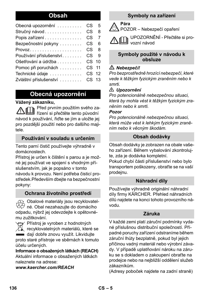 Pára POZOR – Nebezpečí opaření UPOZORNĚNÍ - Přečtěte si provozní návod Symboly použité v návodu k obsluze Nebezpečí! Vážený zákazníku, Před prvním použitím svého zařízení si přečtěte tento původní návod k používání, řiďte se jím a uložte jej pro pozdější použití nebo pro dalšího majitele. Pro bezprostředně hrozící nebezpečí, které vede k těžkým fyzickým zraněním nebo k smrti. 몇 Upozornění Pro potencionálně nebezpečnou situaci, která by mohla vést k těžkým fyzickým zraněním nebo k smrti. Pozor Pro potencionálně nebezpečnou situaci, která může vést k lehkým fyzickým zraněním nebo k věcným škodám. Používání v souladu s určením Obsah dodávky Tento parní čistič používejte výhradně v domácnostech. Přístroj je určen k čištění s parou a je možné jej používat ve spojení s vhodným příslušenstvím, jak je popsáno v tomto návodu k provozu. Není potřeba čisticí prostředek.Především dbejte na bezpečnostní pokyny: Obsah dodávky je zobrazen na obale vašeho zařízení. Během vybalování zkontrolujte, zda je dodávka kompletní. Pokud chybí části příslušenství nebo bylo transportem poškozeny, obraťte se na vaší prodejnu. Obecná upozornění Ochrana životního prostředí Obalové materiály jsou recyklovatelné. Obal nezahazujte do domácího odpadu, nýbrž jej odevzdejte k opětovnému zužitkování. Přístroj je vyroben z hodnotných recyklovatelných materiálů, které se dají dobře znovu využít. Likvidujte proto staré přístroje ve sběrnách k tomuto účelu určených. Informace o obsažených látkách (REACH) Aktuální informace o obsažených látkách naleznete na adrese: www.kaercher.com/REACH