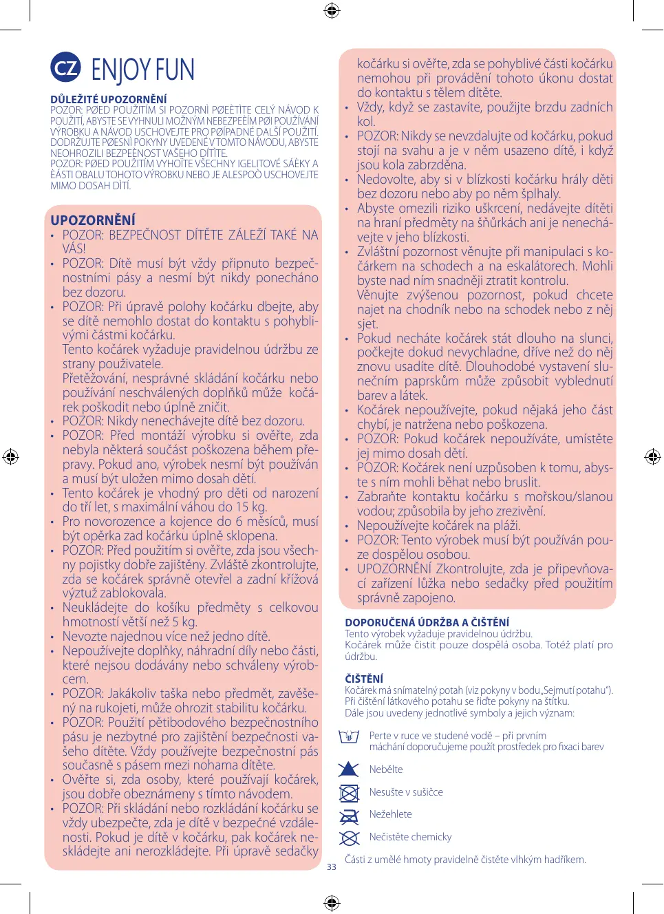 kočárku si ověřte, zda se pohyblivé části kočárku nemohou při provádění tohoto úkonu dostat do kontaktu s tělem dítěte. Vždy, když se zastavíte, použijte brzdu zadních kol. POZOR: Nikdy se nevzdalujte od kočárku, pokud stojí na svahu a je v něm usazeno dítě, i když jsou kola zabrzděna. Nedovolte, aby si v blízkosti kočárku hrály děti bez dozoru nebo aby po něm šplhaly. Abyste omezili riziko uškrcení, nedávejte dítěti na hraní předměty na šňůrkách ani je nenechávejte v jeho blízkosti. Zvláštní pozornost věnujte při manipulaci s kočárkem na schodech a na eskalátorech. Mohli byste nad ním snadněji ztratit kontrolu. Věnujte zvýšenou pozornost, pokud chcete najet na chodník nebo na schodek nebo z něj sjet. Pokud necháte kočárek stát dlouho na slunci, počkejte dokud nevychladne, dříve než do něj znovu usadíte dítě. Dlouhodobé vystavení slunečním paprskům může způsobit vyblednutí barev a látek. Kočárek nepoužívejte, pokud nějaká jeho část chybí, je natržena nebo poškozena. POZOR: Pokud kočárek nepoužíváte, umístěte jej mimo dosah dětí. POZOR: Kočárek není uzpůsoben k tomu, abyste s ním mohli běhat nebo bruslit. Zabraňte kontaktu kočárku s mořskou/slanou vodou; způsobila by jeho zrezivění. Nepoužívejte kočárek na pláži. POZOR: Tento výrobek musí být používán pouze dospělou osobou. UPOZORNĚNÍ Zkontrolujte, zda je připevňovací zařízení lůžka nebo sedačky před použitím správně zapojeno. DOPORUČENÁ ÚDRŽBA A ČIŠTĚNÍ Tento výrobek vyžaduje pravidelnou údržbu. Kočárek může čistit pouze dospělá osoba. Totéž platí pro údržbu.