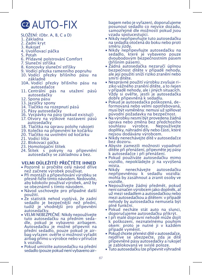AUTO-FIX SLOŽENÍ: (Obr. A, B, C a D) 1. Základna 2. Zadní kryt 3. Rukojeť 4. Uvolňovací páčka 5. Potah 6. Přídavné polstrování Comfort 7. Sluneční stříška 8. Koncovky sluneční stříšky 9. Vodící přezka ramenního popruhu 10. Vodící přezky břišního pásu na základně 10A. Vodící přezky břišního pásu na autosedačce 11. Centrální pás na utažení pásů autosedačky 12. Spona pásu 13. Jazýčky spony 14. Tlačítko na rozepnutí pásů 15. Pásy autosedačky 16. Vycpávky na pásy (pokud existují) 17. Otvory na výškové nastavení pásů autosedačky 18. Tlačítka na úpravu polohy rukojeti 19. Kolečko na připevnění ke kočárku 20. Tlačítko na uvolnění od kočárku 21. Vodící lišta 22. Blokovací páčka 23. Homologační štítek 24. Štítek s pokyny na připevnění autosedačky se základnou a bez.