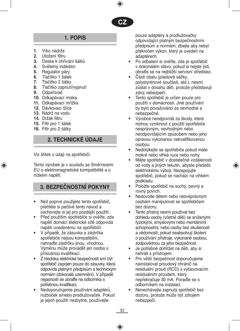 SPOTŘEBIČů Pokud chcete obnovit původní nastavení, stiskněte zároveň tlačítka pro jeden a dva šálky (6 a 7) po dobu 3 vteřin. Světelný indikátor (4) zabliká a nastavení se změní, když přestane blikat. Po ukončení doby své životnosti nesmí být výrobek odklizen společně s domácím odpadem. Je třeba zabezpečit jeho odevzdání na specializovaná místa sběru tříděného odpadu, zřizovaných městskou správou anebo prodejcem, který zabezpečuje tuto službu. Oddělená likvidace elektrospotřebičů je zárukou prevence negativních vlivů na životní prostředí a na zdraví, které způsobuje nevhodné nakládání, umožňuje recyklaci jednotlivých materiálů a tím i významnou úsporu energií a surovin. Aby jsme zdůraznili povinnost spolupracovat při separovaném sběru, je na výrobku znak, který označuje doporučení nepoužít na jeho likvidaci tradiční kontejnery. Další informace vám poskytnou místní orgány, nebo obchod, ve kterém jste výrobek zakoupili.