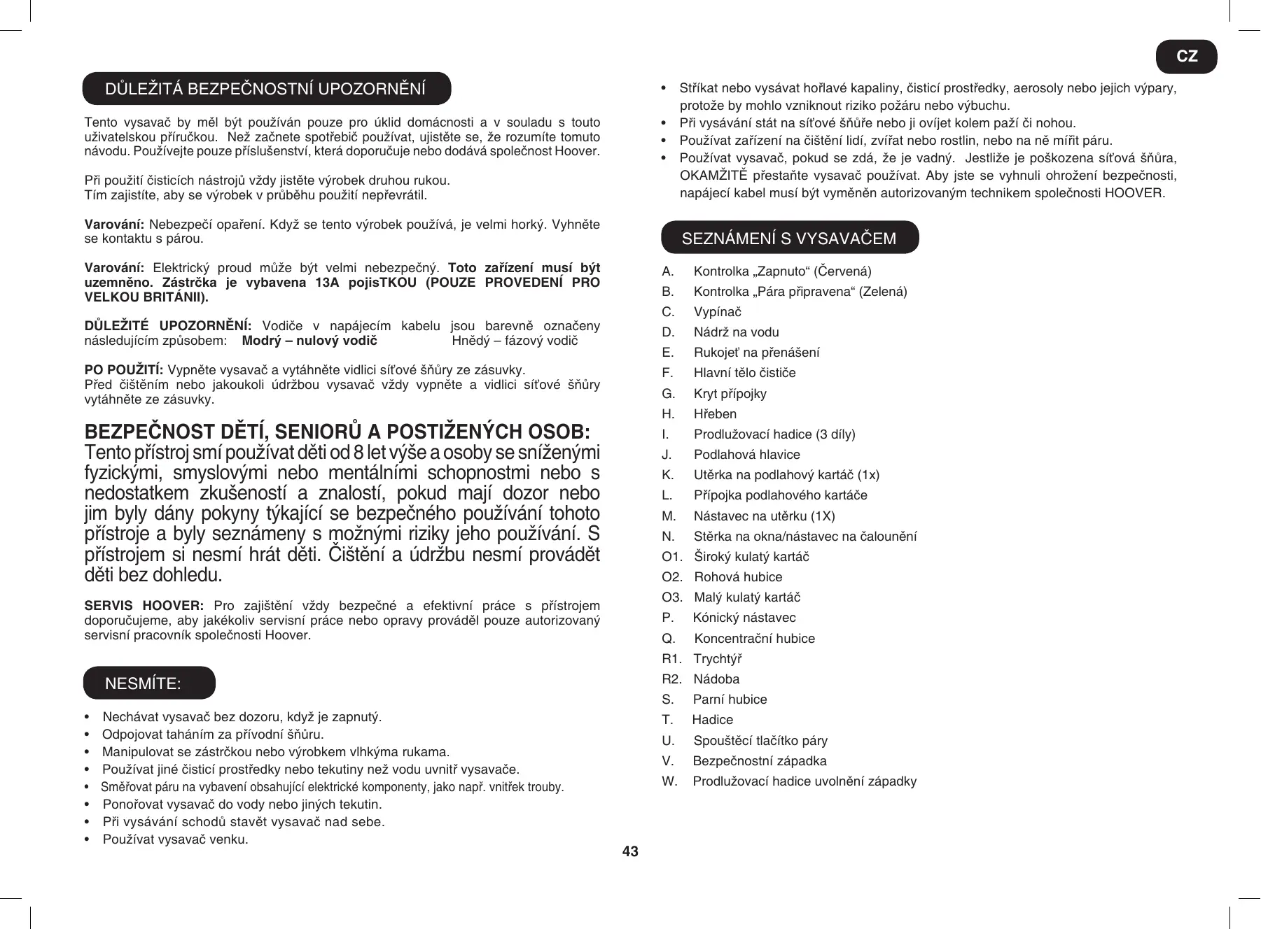 Při použití čisticích nástrojů vždy jistěte výrobek druhou rukou. Tím zajistíte, aby se výrobek v průběhu použití nepřevrátil. Stříkat nebo vysávat hořlavé kapaliny, čisticí prostředky, aerosoly nebo jejich výpary, protože by mohlo vzniknout riziko požáru nebo výbuchu. Při vysávání stát na síťové šňůře nebo ji ovíjet kolem paží či nohou. Používat zařízení na čištění lidí, zvířat nebo rostlin, nebo na ně mířit páru. Používat vysavač, pokud se zdá, že je vadný. Jestliže je poškozena síťová šňůra, OKAMŽITĚ přestaňte vysavač používat. Aby jste se vyhnuli ohrožení bezpečnosti, napájecí kabel musí být vyměněn autorizovaným technikem společnosti HOOVER. Varování: Nebezpečí opaření. Když se tento výrobek používá, je velmi horký. Vyhněte se kontaktu s párou. Seznámení s vysavačem Tento vysavač by měl být používán pouze pro úklid domácnosti a v souladu s touto uživatelskou příručkou. Než začnete spotřebič používat, ujistěte se, že rozumíte tomuto návodu. Používejte pouze příslušenství, která doporučuje nebo dodává společnost Hoover.
