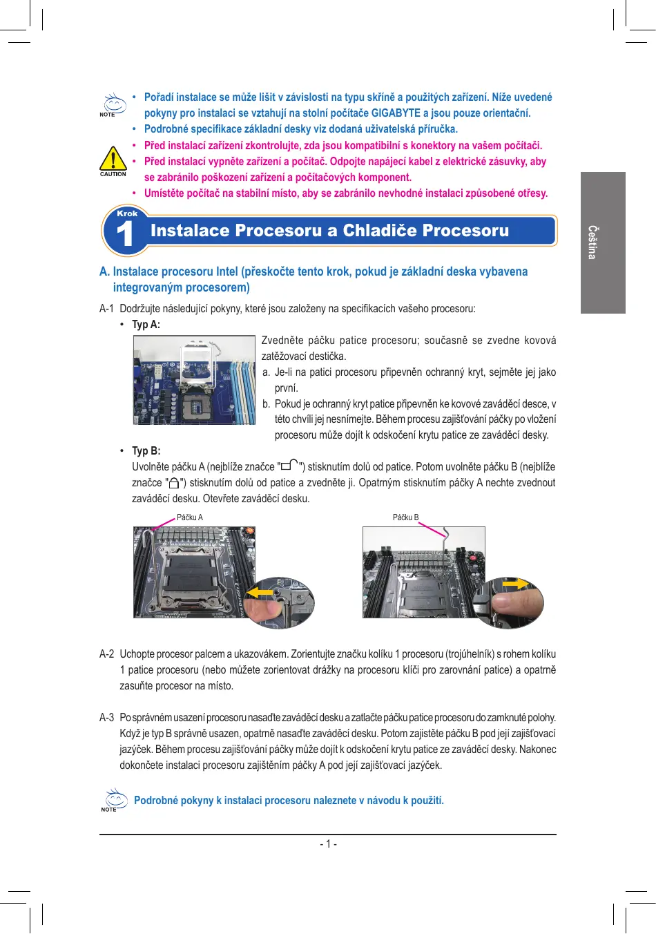 - • Typ B: Uvolněte páčku A (nejblíže značce " ") stisknutím dolů od patice. Potom uvolněte páčku B (nejblíže značce " ") stisknutím dolů od patice a zvedněte ji. Opatrným stisknutím páčky A nechte zvednout zaváděcí desku. Otevřete zaváděcí desku. Páčku A Páčku B A-2 Uchopte procesor palcem a ukazovákem. Zorientujte značku kolíku 1 procesoru (trojúhelník) s rohem kolíku 1 patice procesoru (nebo můžete zorientovat drážky na procesoru klíči pro zarovnání patice) a opatrně zasuňte procesor na místo. A-3 Po správném usazení procesoru nasaďte zaváděcí desku a zatlačte páčku patice procesoru do zamknuté polohy. Když je typ B správně usazen, opatrně nasaďte zaváděcí desku. Potom zajistěte páčku B pod její zajišťovací jazýček. Během procesu zajišťování páčky může dojít k odskočení krytu patice ze zaváděcí desky. Nakonec dokončete instalaci procesoru zajištěním páčky A pod její zajišťovací jazýček. Podrobné pokyny k instalaci procesoru naleznete v návodu k použití.