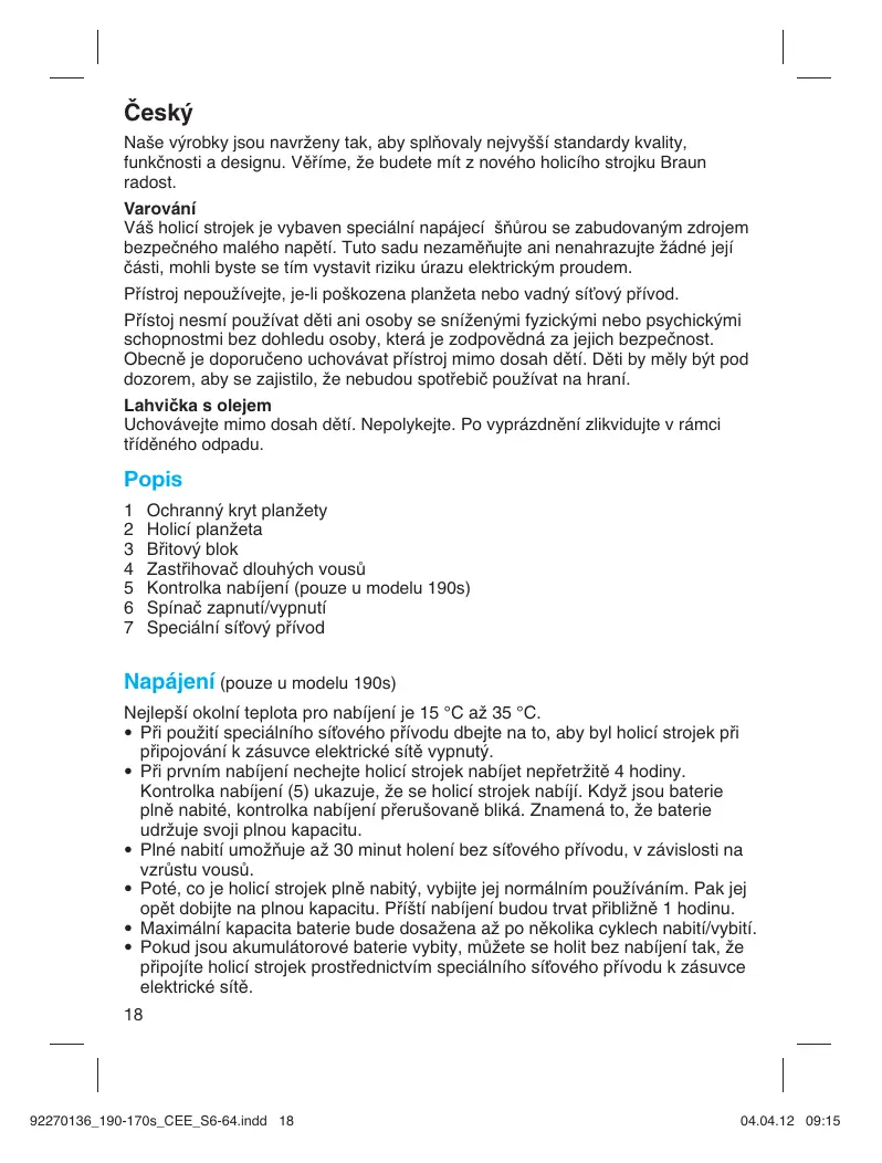 âesk˘ Naše výrobky jsou navrženy tak, aby splňovaly nejvyšší standardy kvality, funkčnosti a designu. Věříme, že budete mít z nového holicího strojku Braun radost. Varování Váš holicí strojek je vybaven speciální napájecí šňůrou se zabudovaným zdrojem bezpečného malého napětí. Tuto sadu nezaměňujte ani nenahrazujte žádné její části, mohli byste se tím vystavit riziku úrazu elektrickým proudem. Přístroj nepoužívejte, je-li poškozena planžeta nebo vadný síťový přívod. Pfiístoj nesmí pouÏívat dûti ani osoby se sníÏen˘mi fyzick˘mi nebo psychick˘mi schopnostmi bez dohledu osoby, která je zodpovûdná za jejich bezpeãnost. Obecnû je doporuãeno uchovávat pfiístroj mimo dosah dûtí. Děti by měly být pod dozorem, aby se zajistilo, že nebudou spotřebič používat na hraní. Lahvička s olejem Uchovávejte mimo dosah dětí. Nepolykejte. Po vyprázdnění zlikvidujte v rámci tříděného odpadu. Popis