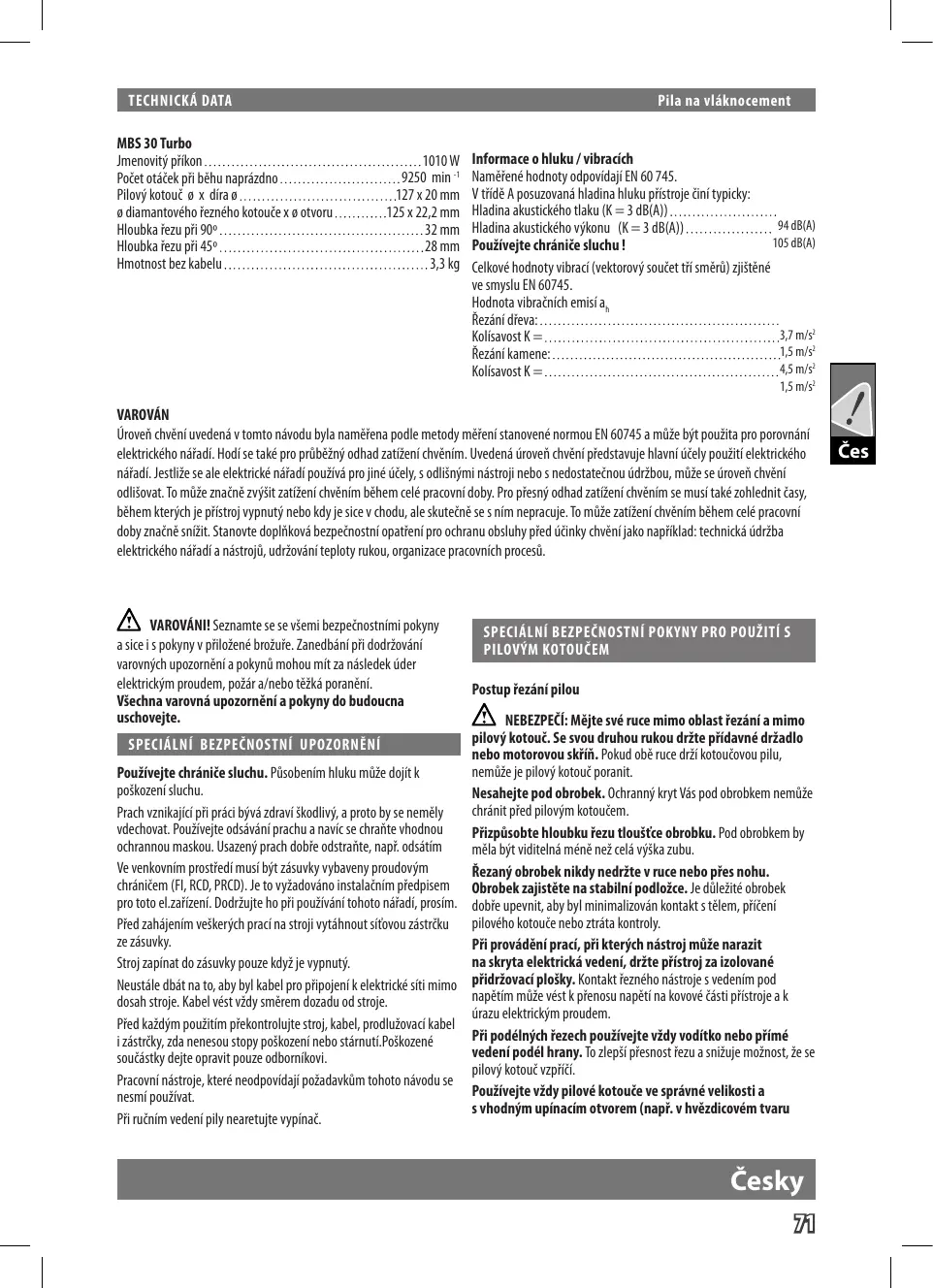 TECHNICKA DATA MBS 30 Turbo Amenovitÿ pitkon 1010W Poëet otécek pi béhu naprézdno 9250 min * 12720 mm 125x22,2mm 32mm 28mm 33kg Plovÿ kotoué 0 x diran…… 9 diamantového iezného kotouce x 6 otvoru… Houbla fezu pi 90° Houbla iezu pi 45° Hmotnost bez kabelu. VAROVAN Informace 0 hluku / vibracich Namëfené hodnoty odpovidai EN 60 745. Vtidë À posuzovand hladina hluku pristroje Hlädina akustického taku (K = 3 dB(A)).…… Hadina akustického vjkonu o4dBta) Pouäivejte chränice sluch 105 dB) Celkové hodnoty vibraci (vektorovÿ souéet ti smér zjétêné ve smyslu EN 60745. Kolisavost K = 37 m/s Rezänikamené 15 ms Kolisavost K = 45 m/s 1,5 m/s Üroveñ chvêniuvedené v tomto névodu byla naméïena podie metody méfeni stanovené normou EN 60745 a müe bit pouñia pro porovnäni elektrického nétadi. béhem kterjeh je pstroj vypnutÿ nebo kdy je ice v chodu, al skuteënë se nim nepracuje. To müge zatieni chvënim béhem clé pracovni odhad zatieni chvénim. Uvedené droveñ chvèni piedstavuje hlavni cely pousitelektrického à pr jiné déely,s odlänÿminéstrojnebo s nedostateënou drébou, me se droveñ chvëni doby maëné st. Stanovte doplikové ezpeënostni opatfeni pro ochranu obsluhy pied déinky chvënijako napfiklad:technickä ddréba elektricého néfadi néstrojü,udréovéniteplotyrukou, organizace pracovnich procesü. VAN VAROVANI! Seznamte se se véemi bezpeëénostnimi pokyny asiceis polyny v piloñené brouïe.Zanedbäni pi dodréovéni varovnÿch upozoméni a pokynû mohou mit za nésledek der elektrickÿm proudem, poär a/nebo téiké poranëni. Véechna varovnä upozornéni a pokyny do budoucna uschovejte. Pouäivejte chränice sluchu. Püsobenim hluku müge dojt k pokozenisluchu. Prach vanikajc ph préc bjvé zdrau Skodiv, a proto by se nemëly vdechonat. Pouzivete odsävéné prachu a navic se chrañte vhodnou ochrannou maskou. Usazenÿ prach dobie odstrñte,napi. odsétim Ve venkovnim prostiedi musi bÿt zésuvky vybaveny proudovÿm chréniéem (Fl, RCD, PRCD). Je to vyéadoväno instalaénim piedpisem pro toto el zañzeni. Dodräujte ho pi pouäivni tohoto né, prosim. Pied zahéjenim veskerjch praci na stroji vytéhnout ifovou zéstréku ze zisuik). Stroj zapinat do zésuvky pouze dy je vypnut. Aeustâle dbât na to, aby by kabel pro piipojenk elektrické st mimo dosah stroe. Kabel véstvidy smérem dozadu odstroje. Pied kañdÿm pouäitim piekontroujt stoj, kebel,produiovaci kabel izéstrky, da nenesou stopy poëkozeni nebo stémuti.Poëkozené souééstky dejte opravit pouze odborikoi. Pracovni néstrje, které neodpovidaji poéadauküm tohoto névodu se nesmi pouzat. Püruënim vedenipiy nearetujte vypinai. SPECIALNI