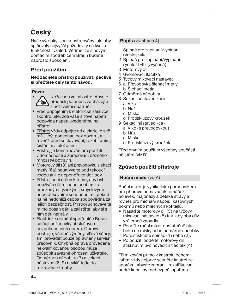 Nože jsou velmi ostré! Abyste předešli poranění, zacházejte s noži velmi opatrně. Před připojením k elektrické zásuvce zkontrolujte, zda vaše síťové napětí odpovídá napětí uvedenému na přístroji. Přístroj vždy odpojte od elektrické sítě, má-li být ponechán bez dozoru, a rovněž před sestavování, rozebíráním, čištěním a uložením. Přístroj je konstruován pro použití v domácnosti a zpracování běžného množství potravin. Motorový díl (3) ani převodovku šlehací metly (6a) neumývejte pod tekoucí vodou ani je neponořujte do vody. Přístroj není určen k tomu, aby byl používán dětmi nebo osobami s omezenými fyzickými, smyslovými nebo duševními schopnostmi, pokud na ně nedohlíží osoba zodpovědná za jejich bezpečnost. Přístroj uchovávejte mimo dosah dětí a zajistěte, aby si s ním děti nehrály. Elektrické domácí spotřebiče Braun splňují požadavky příslušných bezpečnostních norem. Opravy přístroje, včetně výměny síťové šňůry, smí provádět pouze oprávněný servisní pracovník. Chybná oprava provedená nekvalifikovanou osobou může způsobit závažné ohrožení uživatele. Odměrnou nádobku (7) a sekací nástavce (8, 9) nevkládejte do mikrovlnné trouby. Popis (viz strana 4) 1 Spínač pro zapínání/vypínání: rychlost «I» 2 Spínač pro zapínání/vypínání: rychlost «II» (zvýšená) 3 Motorový díl 4 Uvolňovací tlačítka 5 Tyčový mixovací nástavec 6 a Převodovka šlehací metly b Šlehací metla 7 Odměrná nádobka 8 Sekací nástavec «hc» a Víko b Nůž c Miska d Protiskluzový kroužek 9 Sekací nástavec «ca» a Víko (s převodovkou) b Nůž c Miska d Protiskluzový kroužek Před prvním použitím všechny součásti očistěte (viz B). Způsob použití přístroje Ruční mixér (viz A) Ruční mixér je vynikajícím pomocníkem pro přípravu pomazánek, omáček, polévek, majonézy a dětské stravy a rovněž pro míchání nápojů, kašovitých pokrmů nebo mléčných koktejlů.