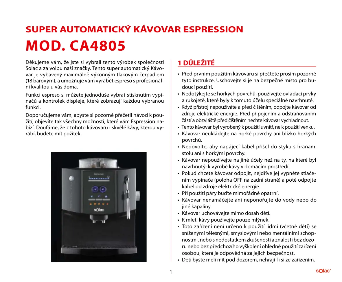 Děkujeme vám, že jste si vybrali tento výrobek společnosti Solac a za volbu naší značky. Tento super automatický Kávovar je vybavený maximálně výkonným tlakovým čerpadlem (18 barovým), a umožňuje vám vyrábět espreso s profesionální kvalitou u vás doma. Funkci espreso si můžete jednoduše vybrat stisknutím vypínačů a kontrolek displeje, které zobrazují každou vybranou funkci. Doporučujeme vám, abyste si pozorně přečetli návod k použití, objevíte tak všechny možnosti, které vám Espression nabízí. Doufáme, že z tohoto kávovaru i skvělé kávy, kterou vyrábí, budete mít požitek.