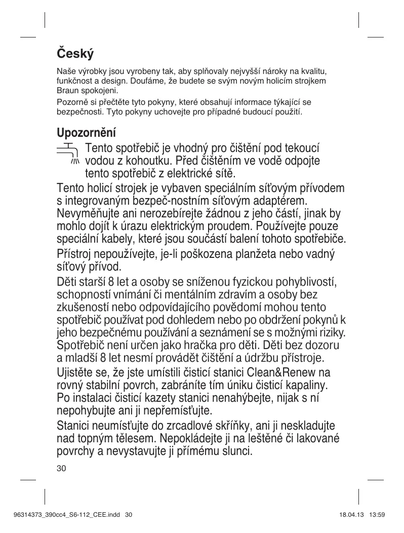 Český Naše výrobky jsou vyrobeny tak, aby splňovaly nejvyšší nároky na kvalitu, funkčnost a design. Doufáme, že budete se svým novým holicím strojkem Braun spokojeni. Pozorně si přečtěte tyto pokyny, které obsahují informace týkající se bezpečnosti. Tyto pokyny uchovejte pro případné budoucí použití. Upozornění Tento spotřebič je vhodný pro čištění pod tekoucí vodou z kohoutku. Před čištěním ve vodě odpojte tento spotřebič z elektrické sítě. Tento holicí strojek je vybaven speciálním síťovým přívodem s integrovaným bezpeč-nostním síťovým adaptérem. Nevyměňujte ani nerozebírejte žádnou z jeho částí, jinak by mohlo dojít k úrazu elektrickým proudem. Používejte pouze speciální kabely, které jsou součástí balení tohoto spotřebiče. Přístroj nepoužívejte, je-li poškozena planžeta nebo vadný síťový přívod. Děti starší 8 let a osoby se sníženou fyzickou pohyblivostí, schopností vnímání či mentálním zdravím a osoby bez zkušeností nebo odpovídajícího povědomí mohou tento spotřebič používat pod dohledem nebo po obdržení pokynů k jeho bezpečnému používání a seznámení se s možnými riziky. Spotřebič není určen jako hračka pro děti. Děti bez dozoru a mladší 8 let nesmí provádět čištění a údržbu přístroje. Ujistěte se, že jste umístili čisticí stanici Clean&Renew na rovný stabilní povrch, zabráníte tím úniku čisticí kapaliny. Po instalaci čisticí kazety stanici nenahýbejte, nijak s ní nepohybujte ani ji nepřemísťujte. Stanici neumísťujte do zrcadlové skříňky, ani ji neskladujte nad topným tělesem. Nepokládejte ji na leštěné či lakované povrchy a nevystavujte ji přímému slunci.