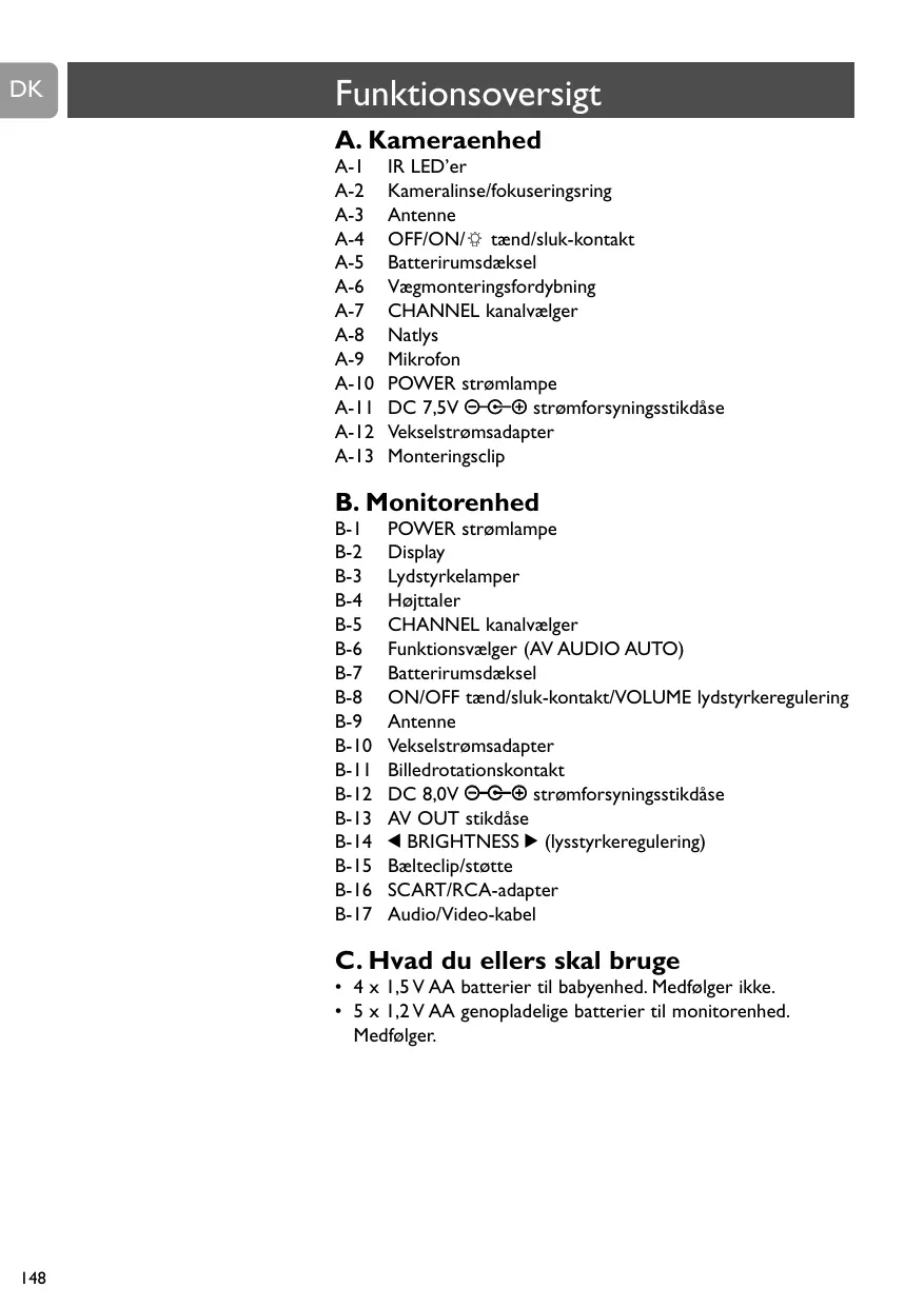 • 4 pilas AA de 1,5 V para la unidad del bebé. No suministrado. • 5 pilas AA de 1,2 V recargables para la unidad del monitor. Otras cosas que necesita