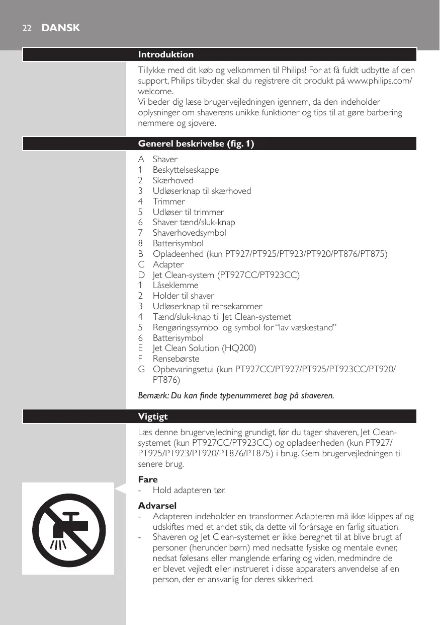 Shaver Beskyttelseskappe Skærhoved Udløserknap til skærhoved Trimmer Udløser til trimmer Shaver tænd/sluk-knap Shaverhovedsymbol Batterisymbol Opladeenhed (kun PT927/PT925/PT923/PT920/PT876/PT875) Adapter Jet Clean-system (PT927CC/PT923CC) Låseklemme Holder til shaver Udløserknap til rensekammer Tænd/sluk-knap til Jet Clean-systemet Rengøringssymbol og symbol for “lav væskestand” Batterisymbol Jet Clean Solution (HQ200) Rensebørste Opbevaringsetui (kun PT927CC/PT927/PT925/PT923CC/PT920/ PT876) Bemærk: Du kan finde typenummeret bag på shaveren. Vigtigt Læs denne brugervejledning grundigt, før du tager shaveren, Jet Cleansystemet (kun PT927CC/PT923CC) og opladeenheden (kun PT927/ PT925/PT923/PT920/PT876/PT875) i brug. Gem brugervejledningen til senere brug. Fare -- Hold adapteren tør. Advarsel -- Adapteren indeholder en transformer. Adapteren må ikke klippes af og udskiftes med et andet stik, da dette vil forårsage en farlig situation. -- Shaveren og Jet Clean-systemet er ikke beregnet til at blive brugt af personer (herunder børn) med nedsatte fysiske og mentale evner, nedsat følesans eller manglende erfaring og viden, medmindre de er blevet vejledt eller instrueret i disse apparaters anvendelse af en person, der er ansvarlig for deres sikkerhed. Dansk
