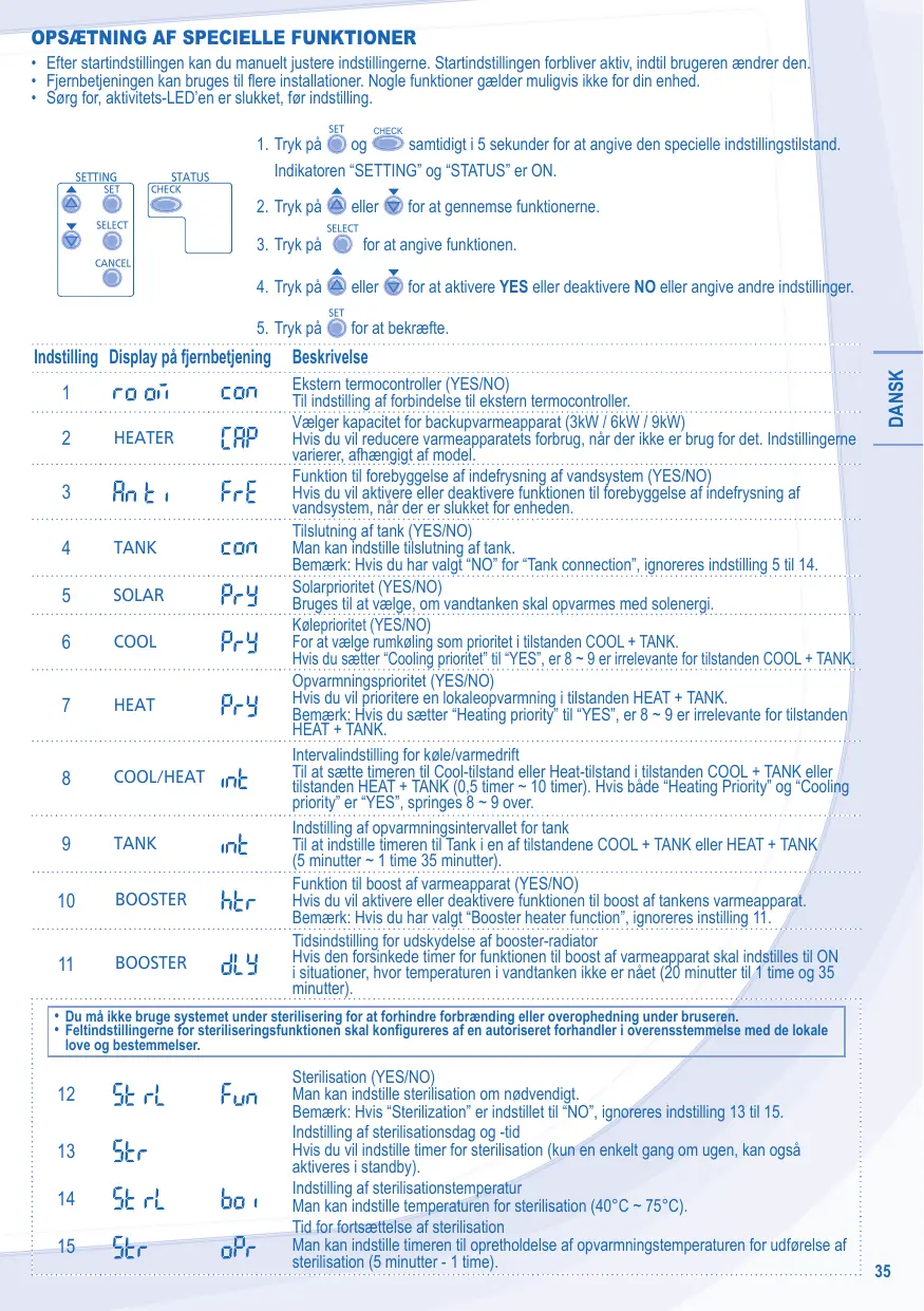 Beskrivelse Ekstern termocontroller (YES/NO) Til indstilling af forbindelse til ekstern termocontroller. Vælger kapacitet for backupvarmeapparat (3kW / 6kW / 9kW) Hvis du vil reducere varmeapparatets forbrug, når der ikke er brug for det. Indstillingerne varierer, afhængigt af model. Funktion til forebyggelse af indefrysning af vandsystem (YES/NO) Hvis du vil aktivere eller deaktivere funktionen til forebyggelse af indefrysning af vandsystem, når der er slukket for enheden. Tilslutning af tank (YES/NO) Man kan indstille tilslutning af tank. Bemærk: Hvis du har valgt “NO” for “Tank connection”, ignoreres indstilling 5 til 14. Solarprioritet (YES/NO) Bruges til at vælge, om vandtanken skal opvarmes med solenergi. Køleprioritet (YES/NO) For at vælge rumkøling som prioritet i tilstanden COOL + TANK. Hvis du sætter “Cooling prioritet” til “YES”, er 8 ~ 9 er irrelevante for tilstanden COOL + TANK. Opvarmningsprioritet (YES/NO) Hvis du vil prioritere en lokaleopvarmning i tilstanden HEAT + TANK. Bemærk: Hvis du sætter “Heating priority” til “YES”, er 8 ~ 9 er irrelevante for tilstanden HEAT + TANK. Intervalindstilling for køle/varmedrift Til at sætte timeren til Cool-tilstand eller Heat-tilstand i tilstanden COOL + TANK eller tilstanden HEAT + TANK (0,5 timer ~ 10 timer). Hvis både “Heating Priority” og “Cooling priority” er “YES”, springes 8 ~ 9 over. Indstilling af opvarmningsintervallet for tank Til at indstille timeren til Tank i en af tilstandene COOL + TANK eller HEAT + TANK (5 minutter ~ 1 time 35 minutter). Funktion til boost af varmeapparat (YES/NO) Hvis du vil aktivere eller deaktivere funktionen til boost af tankens varmeapparat. Bemærk: Hvis du har valgt “Booster heater function”, ignoreres instilling 11. Tidsindstilling for udskydelse af booster-radiator Hvis den forsinkede timer for funktionen til boost af varmeapparat skal indstilles til ON i situationer, hvor temperaturen i vandtanken ikke er nået (20 minutter til 1 time og 35 minutter).