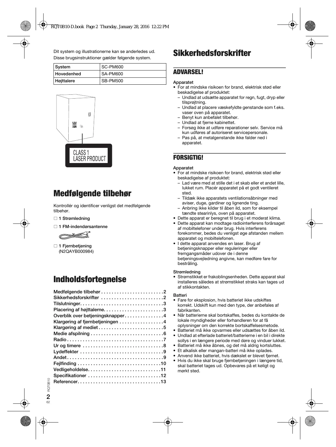 RQT0B10-D.book Page 2 Thursday, January 28, 2016 12:22 PM Dit system og illustrationerne kan se anderledes ud. Disse brugsinstruktioner gælder følgende system. System SC-PM600 Hovedenhed SA-PM600 Højttalere SB-PM500 Sikkerhedsforskrifter ADVARSEL! Apparatet