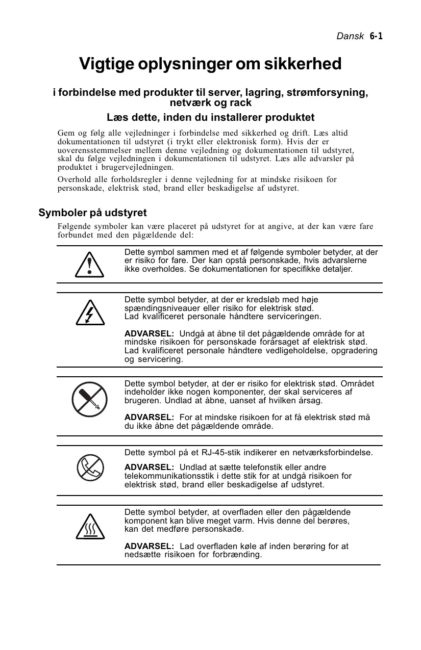 Hvis produktet er udsat for skader, der kræver servicering, skal du afbryde strømmen til produktet, og lade al servicering blive udført af en autoriseret HP serviceyder. Eksempler på skader, der kræver servicering: q Netledningen, forlængerledningen eller stik er blevet beskadiget. q Der er spildt væske eller tabt en genstand på produktet. q Produktet har været udsat for regn eller vand. q Produktet har været tabt eller er blevet beskadiget. q Produktet fungerer ikke normalt, selvom du følger brugervejledningen. Hvis du vil undgå personskade eller beskadigelse af udstyret, skal du: q Undlade at anbringe produktet i nærheden af radiatorer, varmemålere, ovne, forstærkere eller andre produkter, der udsender varme. q Aldrig bruge produktet i fugtige omgivelser. q Undgå at stikke fremmedlegemer ind i åbningerne på produktet. q Være forsigtig, når du flytter produkter i kabinetter. Undgå pludselige stop og ujævne overflader. q Kun bruge produktet med HP produkter, der er beregnet til produktet. q Skrue ned for lydstyrken, inden du bruger hovedtelefoner eller andre lydenheder. Sikkerhed i forbindelse med vedligeholdelse og servicering af Enterprise-produkter Følg nedenstående forholdsregler for at mindske risikoen for elektrisk stød og beskadigelse af udstyret, når du installerer, vedligeholder eller servicerer Enterprise-produkter: ■ Visse Enterprise-produkter indeholder strømforsyningsenheder, der kan frembringe energiniveauer, der anses for farlige. Se i den dokumentation, der følger med produktet, for at se, om produktet indeholder sådanne strømforsyningsenheder. Installationen af internt tilbehør og rutinemæssig vedligeholdelse og servicering af dette produkt skal udføres af personer, der har kendskab til procedurerne, farerne og de forholdsregler, der skal tages ved håndtering af udstyr, der indeholder farlige strømniveauer. ■ Lad produktet køle af, inden du fjerner dækplader og rører ved interne komponenter. ■ Brug ikke ledende værktøj, der kan forbinde strømførende komponenter. ■ Fjern ure, ringe eller løse smykker, mens du arbejder med komponenter med dynamisk tilslutning i en i en tændt server eller tændte lagringsprodukter. ■ Forsøg ikke at tilsidesætte eventuelle sikkerhedsanordninger. ■ PCI-portene med dynamisk tilslutning giver adgang til kredsløb med høje spændingsniveauer. q Portene skal være lukket under normal drift -ellerq Serveren skal være installeret i et sikret område, hvor kun kvalificeret personale har adgang til serveren. ■ Sluk for udstyret, og fjern alle netledninger, inden du fjerner adgangspaneler i områder der ikke understøtter dynamisk tilslutning. Dansk 6-3