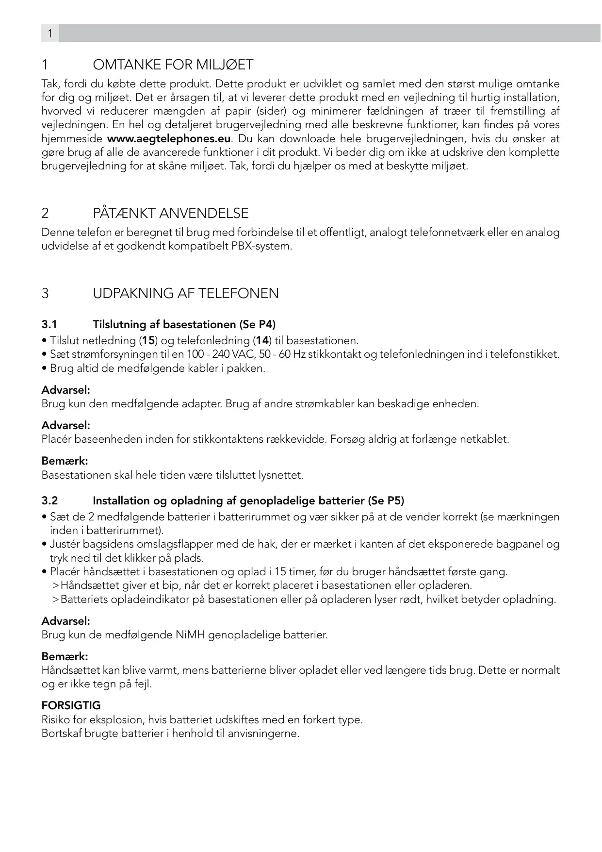 Tak, fordi du købte dette produkt. Dette produkt er udviklet og samlet med den størst mulige omtanke for dig og miljøet. Det er årsagen til, at vi leverer dette produkt med en vejledning til hurtig installation, hvorved vi reducerer mængden af papir (sider) og minimerer fældningen af træer til fremstilling af vejledningen. En hel og detaljeret brugervejledning med alle beskrevne funktioner, kan findes på vores hjemmeside www.aegtelephones.eu. Du kan downloade hele brugervejledningen, hvis du ønsker at gøre brug af alle de avancerede funktioner i dit produkt. Vi beder dig om ikke at udskrive den komplette brugervejledning for at skåne miljøet. Tak, fordi du hjælper os med at beskytte miljøet.