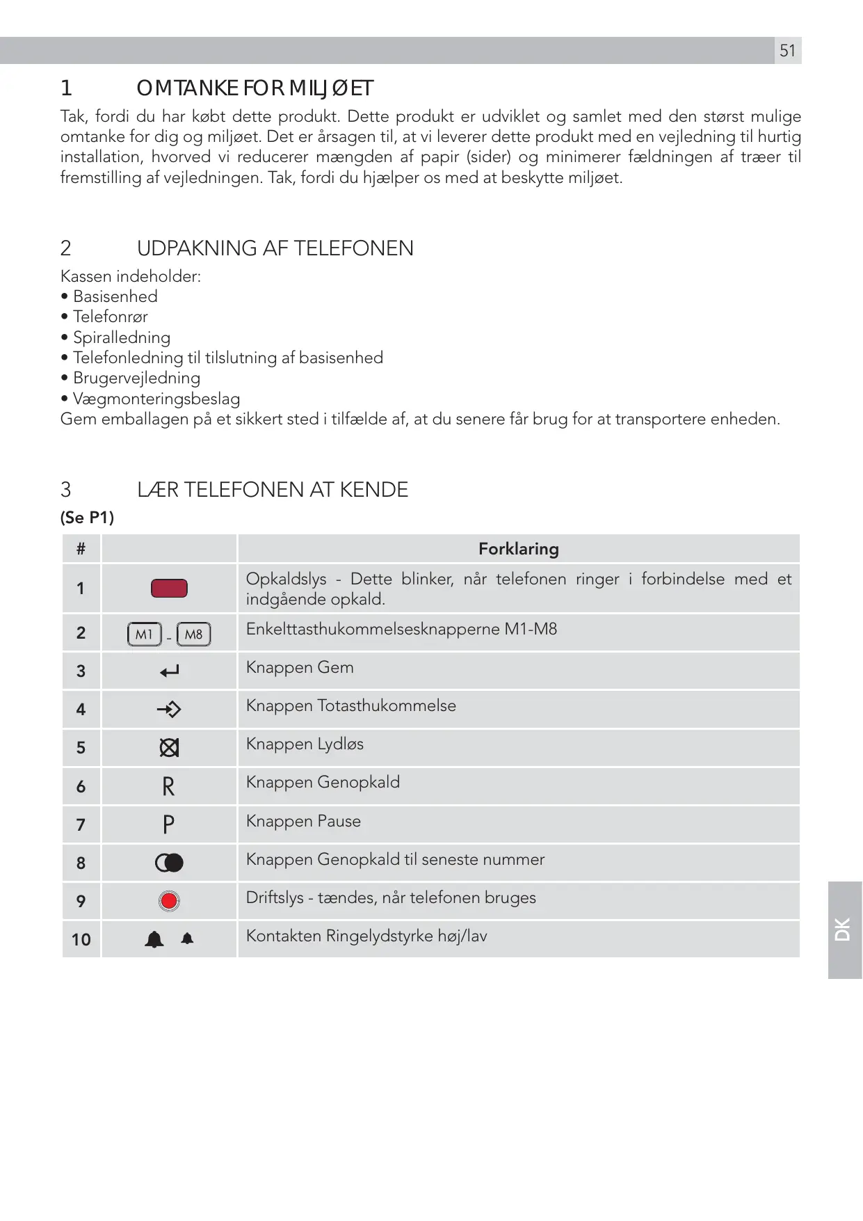 Kassen indeholder: tBasisenhed tTelefonrør tSpiralledning tTelefonledning til tilslutning af basisenhed tBrugervejledning tVægmonteringsbeslag Gem emballagen på et sikkert sted i tilfælde af, at du senere får brug for at transportere enheden.