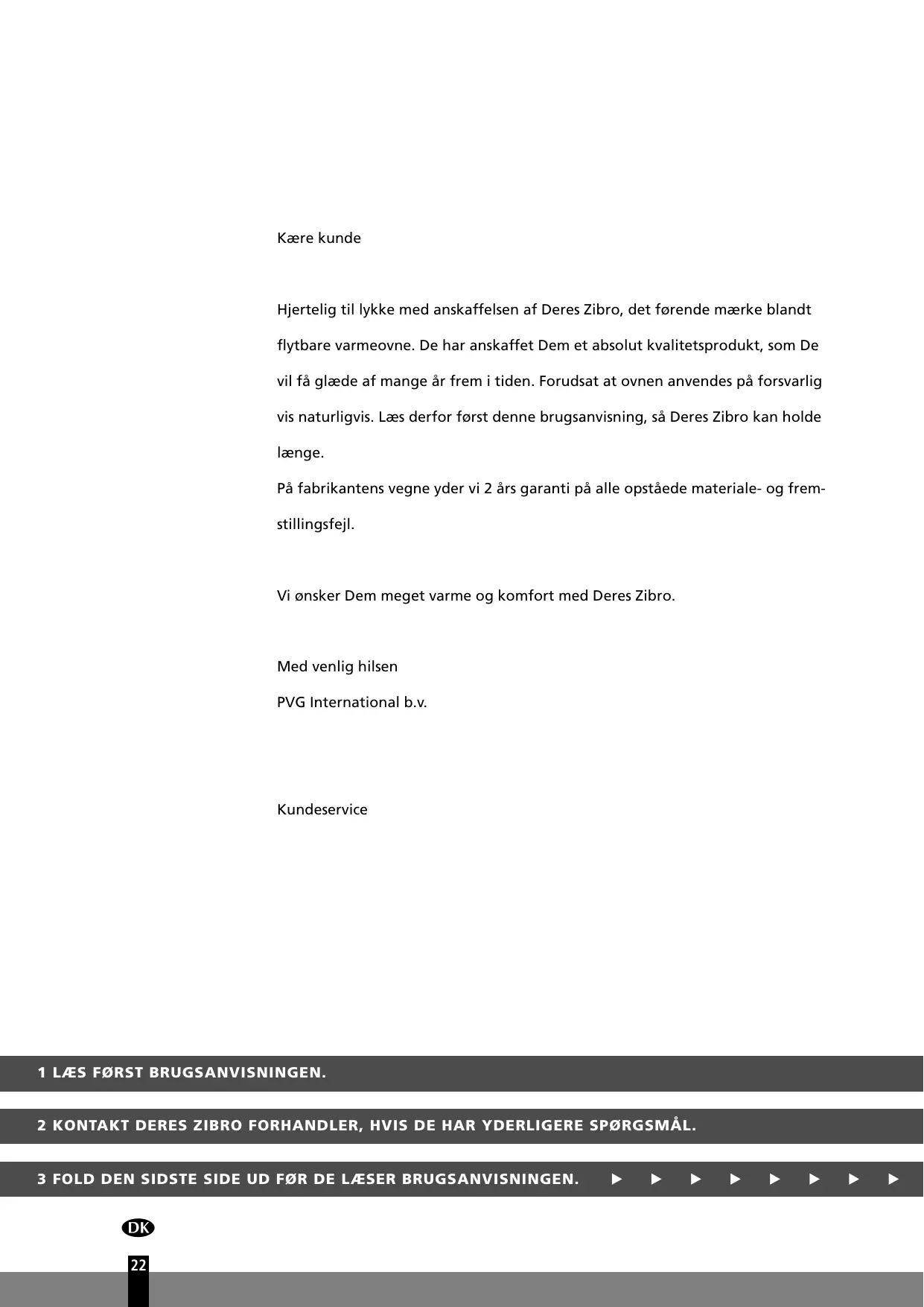 Kære kunde Hjertelig til lykke med anskaffelsen af Deres Zibro, det førende mærke blandt flytbare varmeovne. De har anskaffet Dem et absolut kvalitetsprodukt, som De vil få glæde af mange år frem i tiden. Forudsat at ovnen anvendes på forsvarlig vis naturligvis. Læs derfor først denne brugsanvisning, så Deres Zibro kan holde længe. På fabrikantens vegne yder vi 2 års garanti på alle opståede materiale- og fremstillingsfejl. Vi ønsker Dem meget varme og komfort med Deres Zibro. Med venlig hilsen PVG International b.v. Kundeservice 1 LÆS FØRST BRUGSANVISNINGEN. 2 KONTAKT DERES ZIBRO FORHANDLER, HVIS DE HAR YDERLIGERE SPØRGSMÅL. 3 FOLD DEN SIDSTE SIDE UD FØR DE LÆSER BRUGSANVISNINGEN.