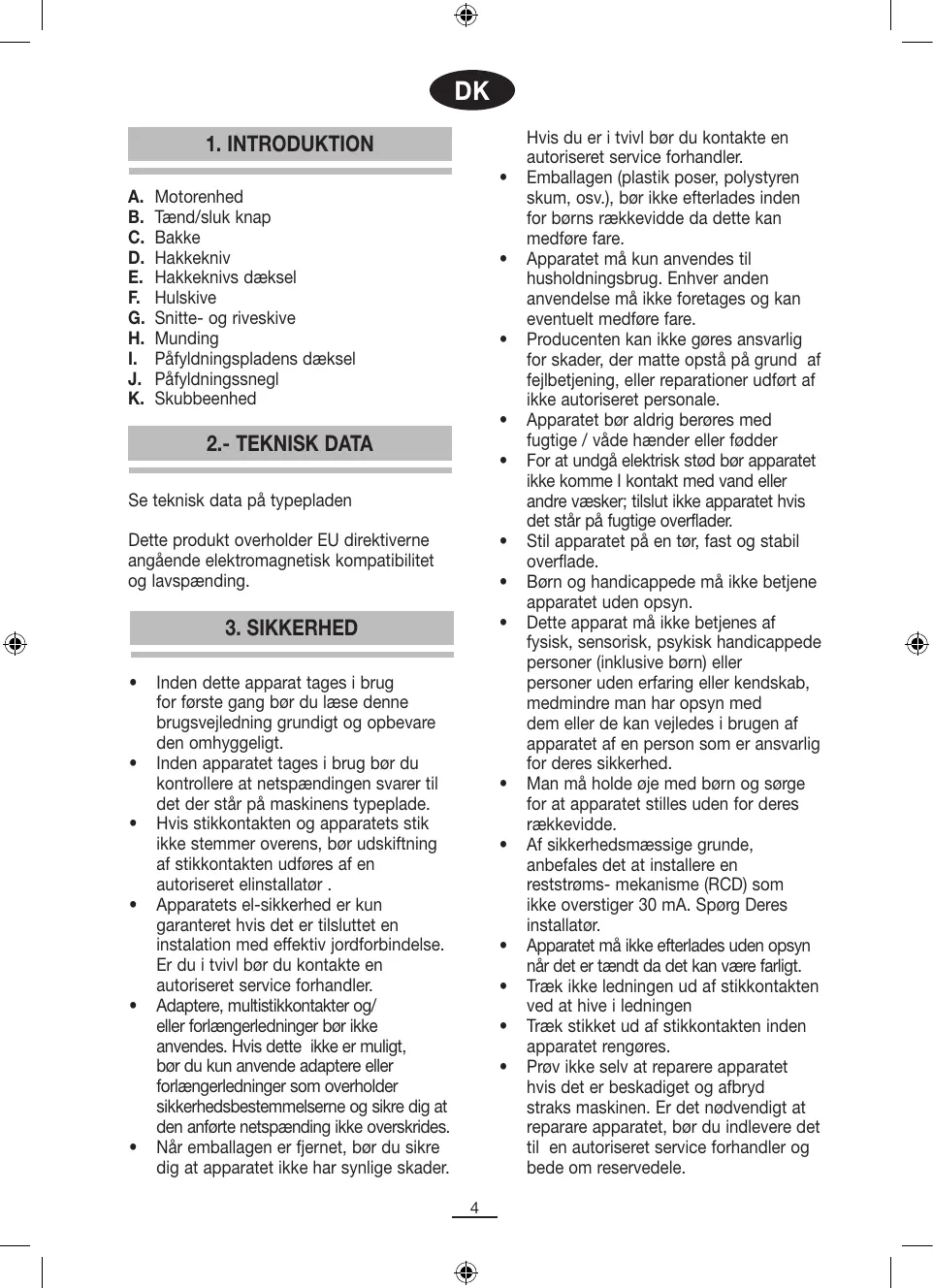- Sørg for at dækslet sidder korrekt i sikkerhedslåsen. Hvis ledningen er besakadiget bør du kontakte en autoriseret service forhandler og anmode at få den skiftet ud. Apparatet må ikke bruges udendørs og udsættes for regn, sol, is, osv. Apparatet må ikke efterlades på eller være I nærheden af varmekilder (gas eller el-kogeplade eller en ovn). Brug ikke “svære” eller slibende rengøringsmidler når apparatet skal renses. Varme overflader må ikke berøres. Anvend håndtagene. Undgå at ledningen kommer I kontakt med varme overflader. Man bør sikre sig at apparatet er slukket før der monteres eller afmonteres hakkeknive. Hakkekniven og snitte/riveskiverne bør håndteres forsigtigt da man kan skære sig. Sluk for strømmen før der monteres eller afmonteres hakkeknive. Fjern ikke dækslet inden hakkekniven er holdt op med at dreje. Anbring en skål undet mundingen når snitte- og riveskiver anvendes. Brug ikke hakkeknive eller snitte/ riveskiver mere end 1 minut ad gangen. Efter 1 minuts anvendelse, bør man lade apparatet afkøle i 5 minutter. Hårde fødevarer så som kaffebønner, isterninger, sukker, ris, krydderier, osv bør ikke skæres eller hakkes. Inden kød anbringes på bakken bør knogler og brusk fjernes. Fødevarer så som ost, tomat, citron, dadler, fersken, eller dybfrosne madvarar må ikke skæres eller snittes.
