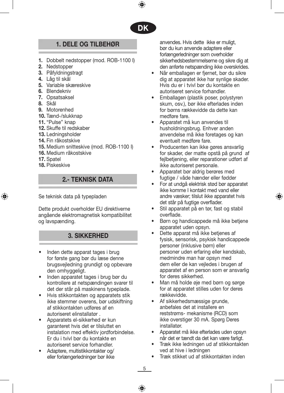 apparatet rengøres. Prøv ikke selv at reparere apparatet hvis det er beskadiget og afbryd straks maskinen. Er det nødvendigt at reparare apparatet, bør du indlevere det til en autoriseret service forhandler og bede om reservedele. Hvis ledningen er besakadiget bør du kontakte en autoriseret service forhandler og anmode at få den skiftet ud. Apparatet må ikke bruges udendørs og udsættes for regn, sol, is, osv. Apparatet må ikke efterlades på eller være I nærheden af varmekilder (gas eller el-kogeplade eller en ovn). Brug ikke “svære” eller slibende rengøringsmidler når apparatet skal renses. Varme overflader må ikke berøres. Anvend håndtagene. Undgå at ledningen kommer I kontakt med varme overflader. Vær forsigtig når De placerer eller fjerner redskaberne. Knivene og skæreskiverne er meget skarpe. Sluk for apparatet inden aftagning eller udskiftning af tilbehør. Fjern ikke låget fra skålen før kniven står helt stille. Tag kun fat i redskabernes kunststofdele da knivene og skæreskiverne er skarpe. Sluk altid for apparatet inden De placerer eller fjerner tilbehør, inden apparatet rengøres og når apparatet ikke anvendes. Hæld ikke varme væsker i skålen. Lad ikke apparatet fungere i mere end 4 minutter ad gangen. Fjern altid kniven eller skæreskiven inden skålens indhold tømmes. Skub aldrig ingredienser ned i skålen med fingrene mens apparatet er i brug.