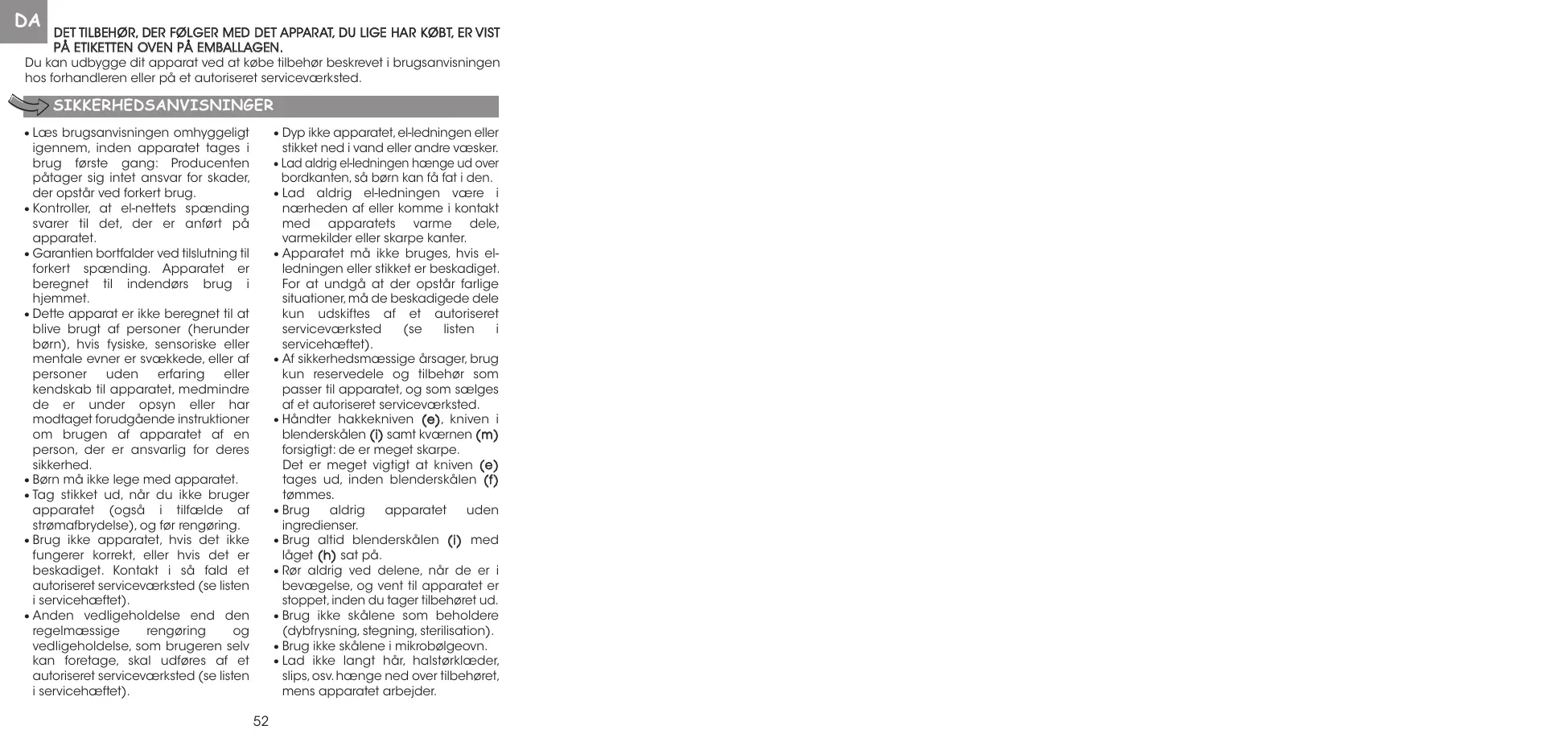 För feste ibrugtagning of apparatet skal plastikbeskyttelsen tages af hakkekniven (e), der er meget skarp. Derefter skal alt tilbehoret vaskes i varmt sæbevand. Skyl delene, og tør dem af.