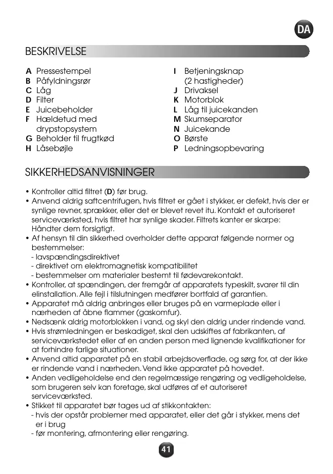 (H) (D) er fastgjort (J). Kontroller, at filtret rigtigt på drivakslen Lad apparatet køle af, og fjern nogle af frugterne eller grøntsagerne. Sluk for apparatet, rengør påfyldningsrøret og filtret (B) (D). Kontakt et autoriseret serviceværksted i forbindelse med andre problemer eller mærkelige hændelser TÆNK PÅ MILJØET! Apparatet indeholder mange materialer, som kan genvindes eller genbruges. Bring det til et indsamlingscenter for genbrug eller et autoriseret serviceværksted, når det ikke skal bruges mere.
