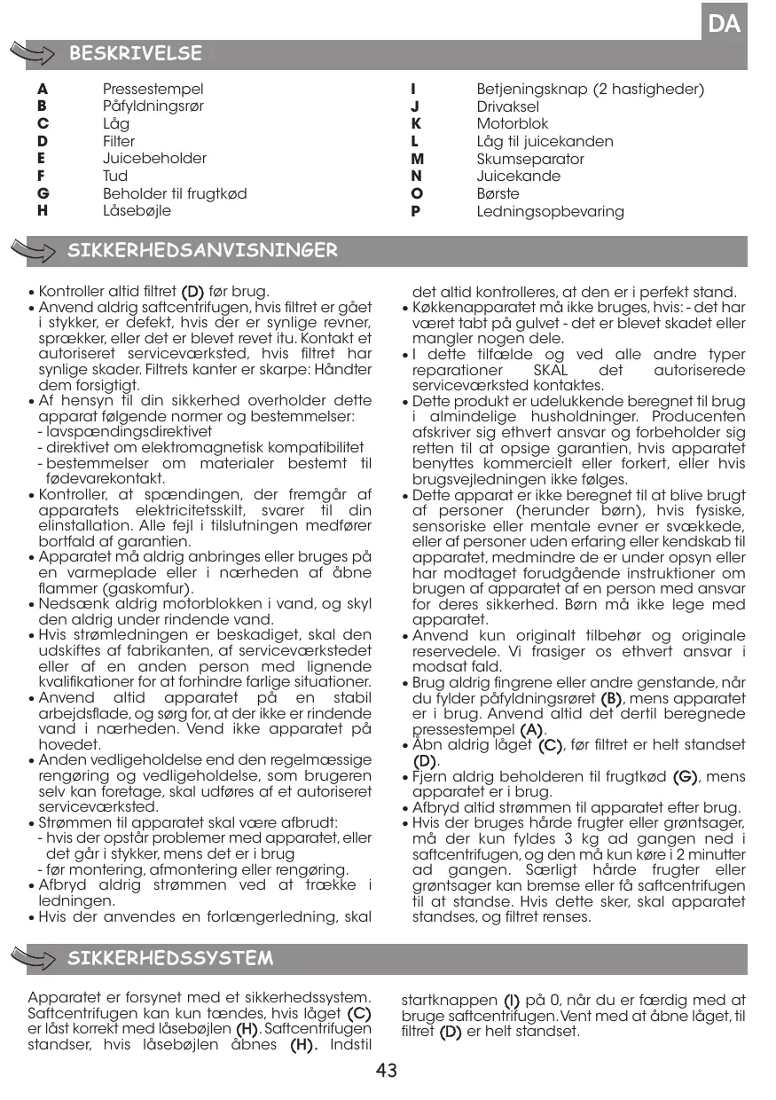 - Hvis der bruges hårde frugter eller grøntsager, må der kun fyldes 3 kg ad gangen ned i saftcentrifugen, og den må kun køre i 2 minutter ad gangen. Særligt hårde frugter eller grøntsager kan bremse eller få saftcentrifugen til at standse. Hvis dette sker, skal apparatet standses, og filtret renses. SIKKERHEDSSYSTEM Apparatet er forsynet med et sikkerhedssystem. Saftcentrifugen kan kun tændes, hvis låget (C) er låst korrekt med låsebøjlen (H). Saftcentrifugen standser, hvis låsebøjlen åbnes (H). Indstil startknappen (I) på 0, når du er færdig med at bruge saftcentrifugen. Vent med at åbne låget, til filtret (D) er helt standset.