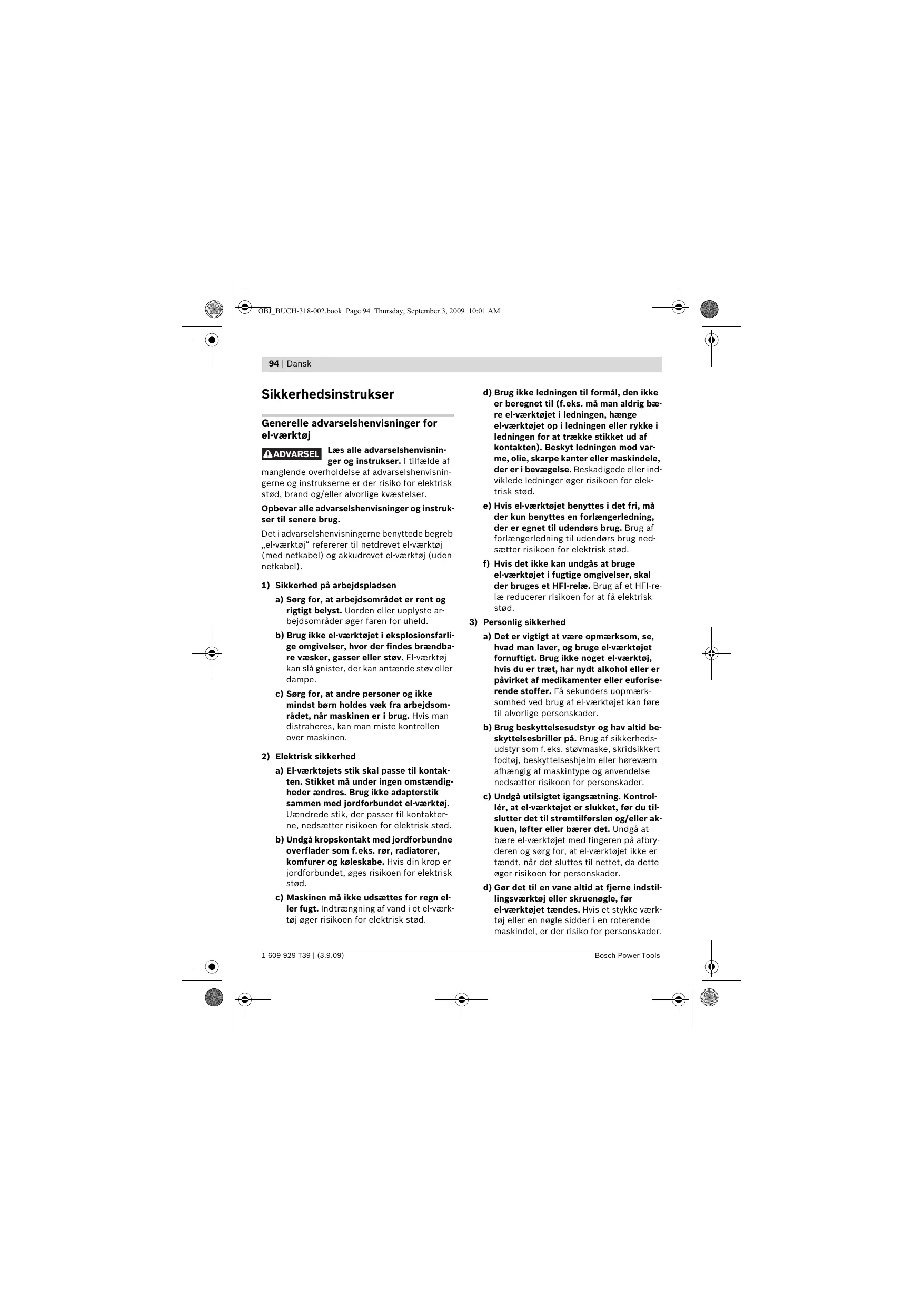 a) Det er vigtigt at være opmærksom, se, hvad man laver, og bruge el-værktøjet fornuftigt. Brug ikke noget el-værktøj, hvis du er træt, har nydt alkohol eller er påvirket af medikamenter eller euforiserende stoffer. Få sekunders uopmærksomhed ved brug af el-værktøjet kan føre til alvorlige personskader. b) Brug beskyttelsesudstyr og hav altid beskyttelsesbriller på. Brug af sikkerhedsudstyr som f.eks. støvmaske, skridsikkert fodtøj, beskyttelseshjelm eller høreværn afhængig af maskintype og anvendelse nedsætter risikoen for personskader. c) Undgå utilsigtet igangsætning. Kontrollér, at el-værktøjet er slukket, før du tilslutter det til strømtilførslen og/eller akkuen, løfter eller bærer det. Undgå at bære el-værktøjet med fingeren på afbryderen og sørg for, at el-værktøjet ikke er tændt, når det sluttes til nettet, da dette øger risikoen for personskader. d) Gør det til en vane altid at fjerne indstillingsværktøj eller skruenøgle, før el-værktøjet tændes. Hvis et stykke værktøj eller en nøgle sidder i en roterende maskindel, er der risiko for personskader. Bosch Power Tools OBJ_BUCH-318-002.book Page 95 Thursday, September 3, 2009 10:01 AM Dansk | 95 e) Undgå en anormal legemsposition. Sørg for at stå sikkert, mens der arbejdes, og kom ikke ud af balance. Dermed har du bedre muligheder for at kontrollere el-værktøjet, hvis der skulle opstå uventede situationer. f) Brug egnet arbejdstøj. Undgå løse beklædningsgenstande eller smykker. Hold hår, tøj og handsker væk fra dele, der bevæger sig. Dele, der er i bevægelse, kan gribe fat i løstsiddende tøj, smykker eller langt hår. g) Hvis støvudsugnings- og opsamlingsudstyr kan monteres, er det vigtigt, at dette tilsluttes og benyttes korrekt. Brug af en støvopsugning kan reducere støvmængden og dermed den fare, der er forbundet støv.