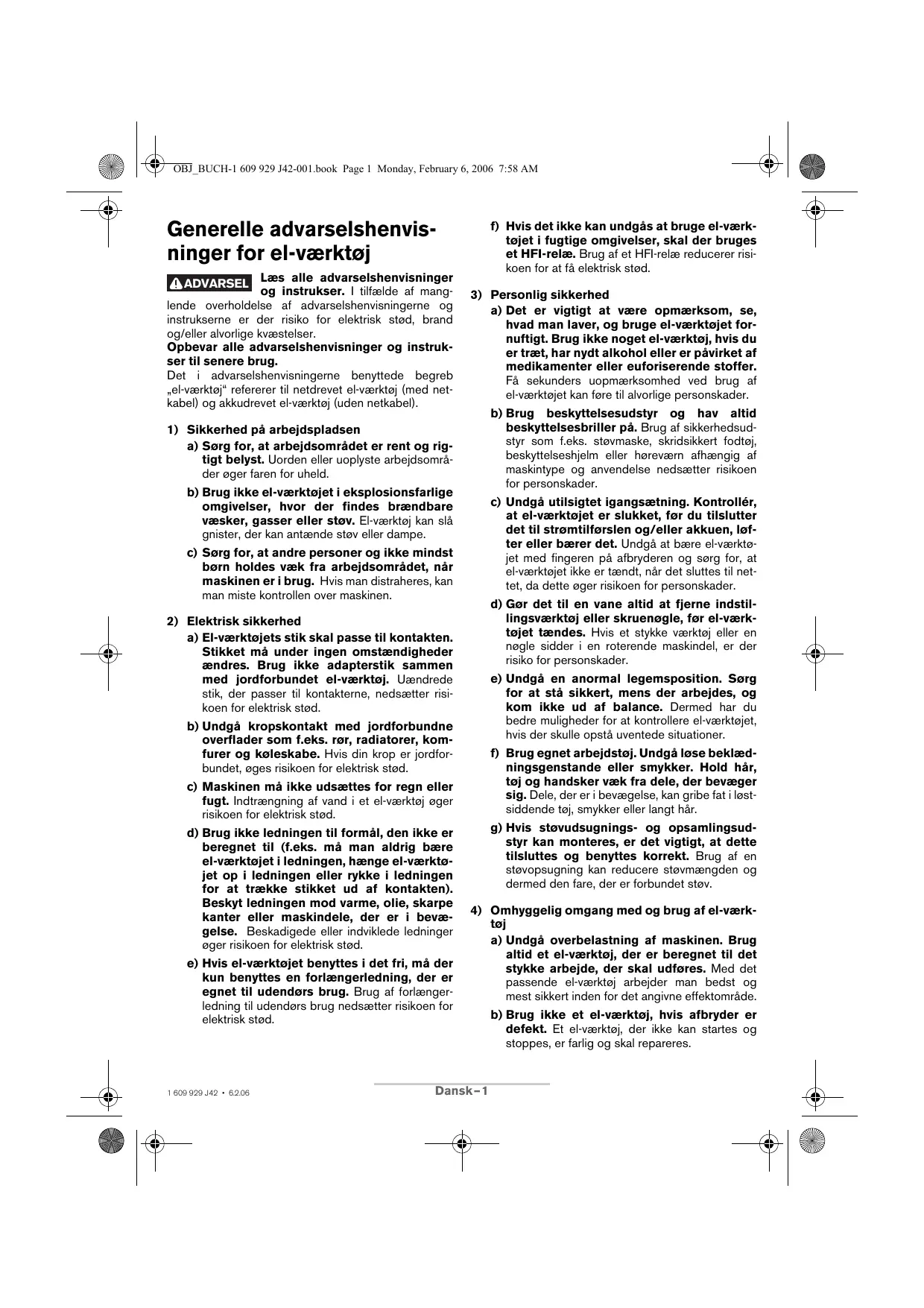 a) Undgå overbelastning af maskinen. Brug altid et el-værktøj, der er beregnet til det stykke arbejde, der skal udføres. Med det passende el-værktøj arbejder man bedst og mest sikkert inden for det angivne effektområde. Dansk–1 b) Brug ikke et el-værktøj, hvis afbryder er defekt. Et el-værktøj, der ikke kan startes og stoppes, er farlig og skal repareres. OBJ_BUCH-1 609 929 J42-001.book Page 2 Monday, February 6, 2006 7:58 AM c) Træk stikket ud af stikkontakten og/eller fjern akkuen, inden maskinen indstilles, der skiftes tilbehørsdele, eller maskinen lægges fra. Disse sikkerhedsforanstaltninger forhindrer utilsigtet start af el-værktøjet. d) Opbevar ubenyttet el-værktøj uden for børns rækkevidde. Lad aldrig personer, der ikke er fortrolige med maskinen eller ikke har gennemlæst disse instrukser, benytte maskinen. El-værktøj er farligt, hvis det benyttes af ukyndige personer. e) El-værktøjet bør vedligeholdes omhyggeligt. Kontroller, om bevægelige maskindele fungerer korrekt og ikke sidder fast, og om delene er brækket eller beskadiget, således at el-værktøjets funktion påvirkes. Få beskadigede dele repareret, inden maskinen tages i brug. Mange uheld skyldes dårligt vedligeholdte el-værktøjer. f) Sørg for, at skæreværktøjer er skarpe og rene. Omhyggeligt vedligeholdte skæreværktøjer med skarpe skærekanter sætter sig ikke så hurtigt fast og er nemmere at føre. g) Brug el-værktøj, tilbehør, indsatsværktøj osv. iht. disse instrukser. Tag hensyn til arbejdsforholdene og det arbejde, der skal udføres. Anvendelse af el-værktøjet til formål, som ligger uden for det fastsatte anvendelsesområde, kan føre til farlige situationer.