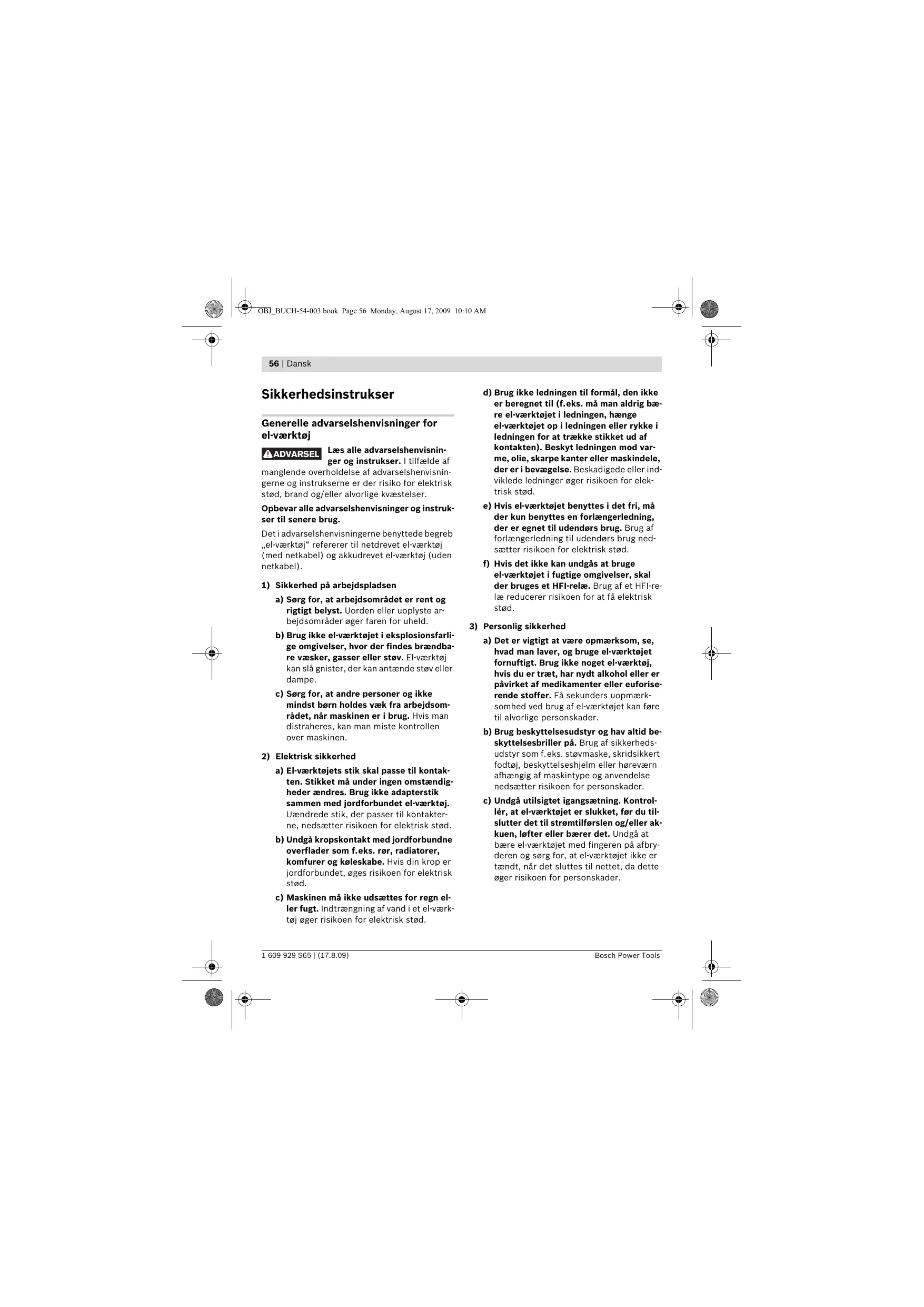 a) Det er vigtigt at være opmærksom, se, hvad man laver, og bruge el-værktøjet fornuftigt. Brug ikke noget el-værktøj, hvis du er træt, har nydt alkohol eller er påvirket af medikamenter eller euforiserende stoffer. Få sekunders uopmærksomhed ved brug af el-værktøjet kan føre til alvorlige personskader. b) Brug beskyttelsesudstyr og hav altid beskyttelsesbriller på. Brug af sikkerhedsudstyr som f.eks. støvmaske, skridsikkert fodtøj, beskyttelseshjelm eller høreværn afhængig af maskintype og anvendelse nedsætter risikoen for personskader. c) Undgå utilsigtet igangsætning. Kontrollér, at el-værktøjet er slukket, før du tilslutter det til strømtilførslen og/eller akkuen, løfter eller bærer det. Undgå at bære el-værktøjet med fingeren på afbryderen og sørg for, at el-værktøjet ikke er tændt, når det sluttes til nettet, da dette øger risikoen for personskader. c) Maskinen må ikke udsættes for regn eller fugt. Indtrængning af vand i et el-værktøj øger risikoen for elektrisk stød. 1 609 929 S65 | (17.8.09) Bosch Power Tools OBJ_BUCH-54-003.book Page 57 Monday, August 17, 2009 10:10 AM Dansk | 57 d) Gør det til en vane altid at fjerne indstillingsværktøj eller skruenøgle, før el-værktøjet tændes. Hvis et stykke værktøj eller en nøgle sidder i en roterende maskindel, er der risiko for personskader. e) Undgå en anormal legemsposition. Sørg for at stå sikkert, mens der arbejdes, og kom ikke ud af balance. Dermed har du bedre muligheder for at kontrollere el-værktøjet, hvis der skulle opstå uventede situationer. f) Brug egnet arbejdstøj. Undgå løse beklædningsgenstande eller smykker. Hold hår, tøj og handsker væk fra dele, der bevæger sig. Dele, der er i bevægelse, kan gribe fat i løstsiddende tøj, smykker eller langt hår. g) Hvis støvudsugnings- og opsamlingsudstyr kan monteres, er det vigtigt, at dette tilsluttes og benyttes korrekt. Brug af en støvopsugning kan reducere støvmængden og dermed den fare, der er forbundet støv.
