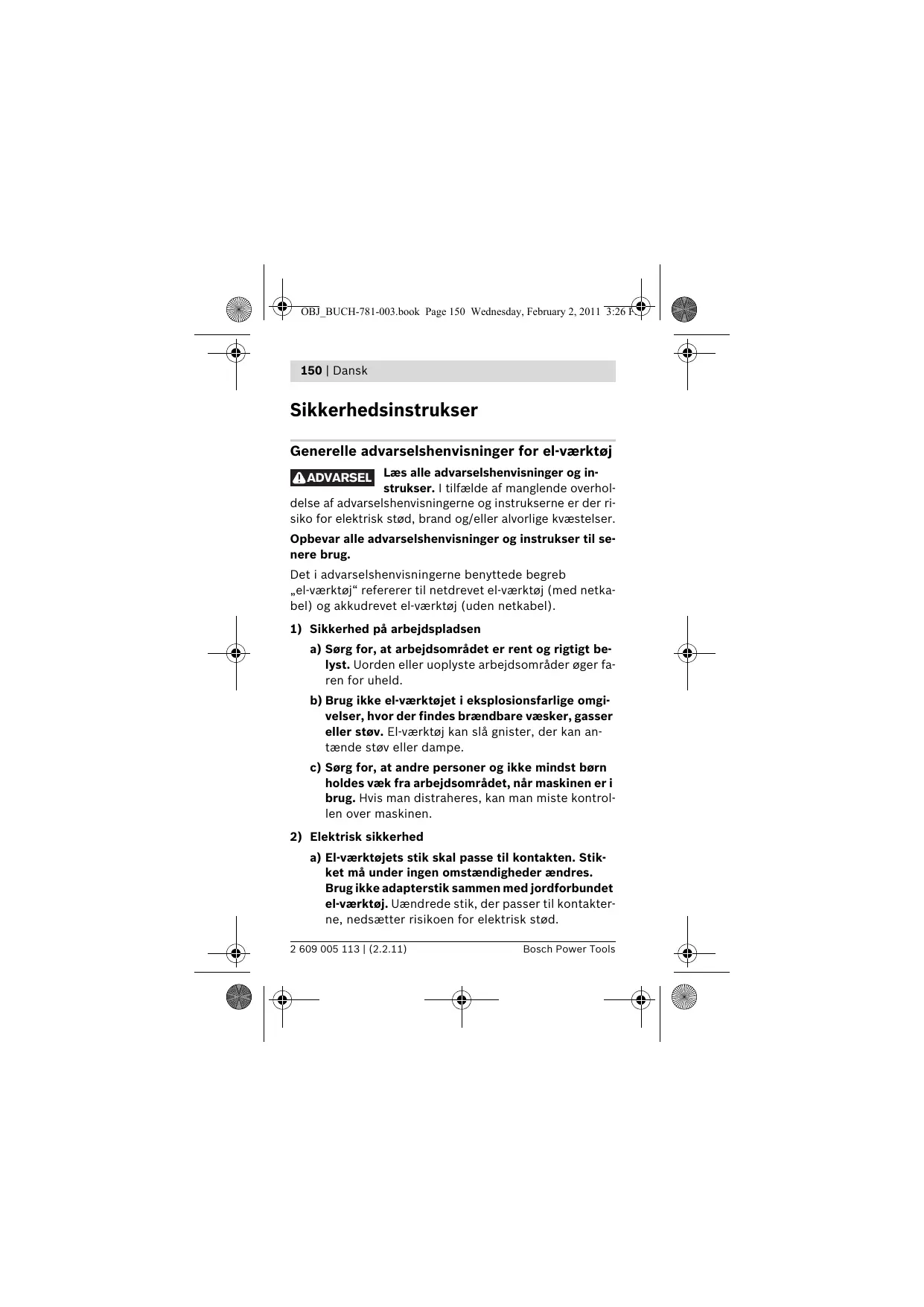 a) Undgå overbelastning af maskinen. Brug altid et el-værktøj, der er beregnet til det stykke arbejde, der skal udføres. Med det passende el-værktøj arbejder man bedst og mest sikkert inden for det angivne effektområde. b) Brug ikke et el-værktøj, hvis afbryder er defekt. Et el-værktøj, der ikke kan startes og stoppes, er farlig og skal repareres. c) Træk stikket ud af stikkontakten og/eller fjern akkuen, inden maskinen indstilles, der skiftes tilbehørsdele, eller maskinen lægges fra. Disse sikkerhedsforanstaltninger forhindrer utilsigtet start af el-værktøjet. d) Opbevar ubenyttet el-værktøj uden for børns rækkevidde. Lad aldrig personer, der ikke er fortrolige med maskinen eller ikke har gennemlæst disse instrukser, benytte maskinen. El-værktøj er farligt, hvis det benyttes af ukyndige personer. e) El-værktøjet bør vedligeholdes omhyggeligt. Kontroller, om bevægelige maskindele fungerer korrekt og ikke sidder fast, og om delene er brækket eller beskadiget, således at el-værktøjets funktion påvirkes. Få beskadigede dele repareret, inden maskinen tages i brug. Mange uheld skyldes dårligt vedligeholdte el-værktøjer. f) Sørg for, at skæreværktøjer er skarpe og rene. Omhyggeligt vedligeholdte skæreværktøjer med skarpe skærekanter sætter sig ikke så hurtigt fast og er nemmere at føre. Bosch Power Tools 2 609 005 113 | (2.2.11) OBJ_BUCH-781-003.book Page 154 Wednesday, February 2, 2011 3:26 PM 154 | Dansk g) Brug el-værktøj, tilbehør, indsatsværktøj osv. iht. disse instrukser. Tag hensyn til arbejdsforholdene og det arbejde, der skal udføres. Anvendelse af el-værktøjet til formål, som ligger uden for det fastsatte anvendelsesområde, kan føre til farlige situationer.