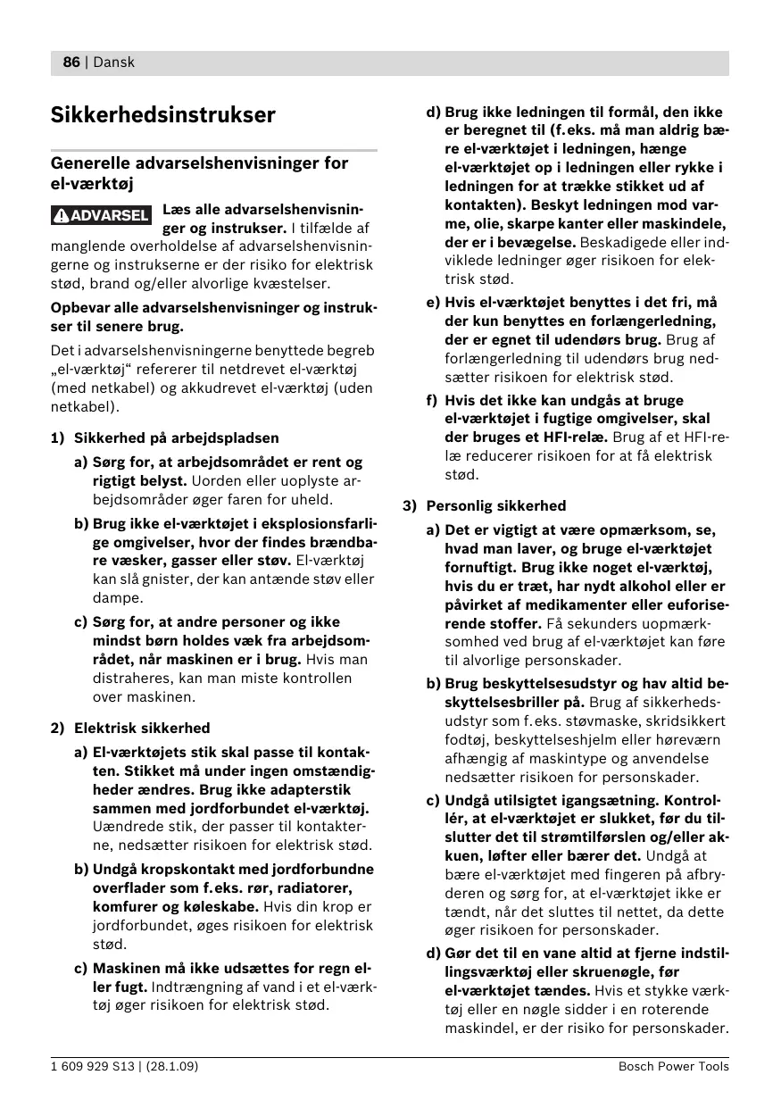 el-værktøj a) Undgå overbelastning af maskinen. Brug altid et el-værktøj, der er beregnet til det stykke arbejde, der skal udføres. Med det passende el-værktøj arbejder man bedst og mest sikkert inden for det angivne effektområde. b) Brug ikke et el-værktøj, hvis afbryder er defekt. Et el-værktøj, der ikke kan startes og stoppes, er farlig og skal repareres. c) Træk stikket ud af stikkontakten og/eller fjern akkuen, inden maskinen indstilles, der skiftes tilbehørsdele, eller maskinen lægges fra. Disse sikkerhedsforanstaltninger forhindrer utilsigtet start af el-værktøjet. d) Opbevar ubenyttet el-værktøj uden for børns rækkevidde. Lad aldrig personer, der ikke er fortrolige med maskinen eller ikke har gennemlæst disse instrukser, benytte maskinen. El-værktøj er farligt, hvis det benyttes af ukyndige personer. e) El-værktøjet bør vedligeholdes omhyggeligt. Kontroller, om bevægelige maskindele fungerer korrekt og ikke sidder fast, og om delene er brækket eller beskadiget, således at el-værktøjets funktion påvirkes. Få beskadigede dele repareret, inden maskinen tages i brug. Mange uheld skyldes dårligt vedligeholdte el-værktøjer. Bosch Power Tools f) Sørg for, at skæreværktøjer er skarpe og rene. Omhyggeligt vedligeholdte skæreværktøjer med skarpe skærekanter sætter sig ikke så hurtigt fast og er nemmere at føre. g) Brug el-værktøj, tilbehør, indsatsværktøj osv. iht. disse instrukser. Tag hensyn til arbejdsforholdene og det arbejde, der skal udføres. Anvendelse af el-værktøjet til formål, som ligger uden for det fastsatte anvendelsesområde, kan føre til farlige situationer.