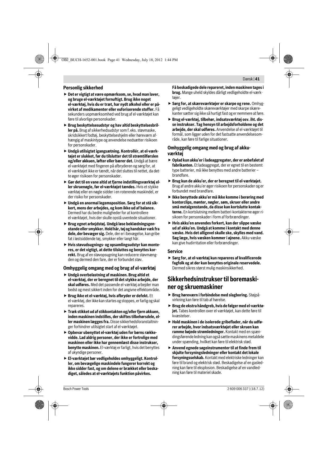 2 609 006 337 | (18.7.12) OBJ_BUCH-1652-001.book Page 40 Wednesday, July 18, 2012 1:44 PM 40 | Dansk Onderhoud en reiniging f Houd het elektrische gereedschap en de ventilatieopeningen altijd schoon om goed en veilig te werken. Klantenservice en advies Dansk Generelle sikkerhedsinstrukser til el-værktøj Onze klantenservice beantwoordt uw vragen over reparatie en onderhoud van uw product en over vervangingsonderdelen. Explosietekeningen en informatie over vervangingsonderdelen vindt u ook op: www.bosch-pt.com De medewerkers van onze klantenservice adviseren u graag bij vragen over de aankoop, het gebruik en de instelling van producten en toebehoren. Vermeld bij vragen en bestellingen van vervangingsonderdelen altijd het uit tien cijfers bestaande zaaknummer volgens het typeplaatje van het elektrische gereedschap. ADVARSEL Læs alle sikkerhedsinstrukser og anvisninger. I tilfælde af manglende overholdelse af sikkerhedsinstrukserne og anvisningerne er der risiko for elektrisk stød, brand og/eller alvorlige kvæstelser. Opbevar alle sikkerhedsinstrukser og anvisninger til senere brug. Det i sikkerhedsinstrukserne benyttede begreb „el-værktøj“ refererer til netdrevet el-værktøj (med netkabel) og akkudrevet el-værktøj (uden netkabel). Nederland Tel.: +31 (076) 579 54 54 Fax: +31 (076) 579 54 94 E-mail: gereedschappen@nl.bosch.com f Sørg for, at arbejdsområdet er rent og rigtigt belyst. Uorden eller uoplyste arbejdsområder øger faren for uheld. f Brug ikke el-værktøjet i eksplosionsfarlige omgivelser, hvor der findes brændbare væsker, gasser eller støv. El-værktøj kan slå gnister, der kan antænde støv eller dampe. f Sørg for, at andre personer og ikke mindst børn holdes væk fra arbejdsområdet, når maskinen er i brug. Hvis man distraheres, kan man miste kontrollen over maskinen. België Tel.: +32 2 588 0589 Fax: +32 2 588 0595 E-mail: outillage.gereedschap@be.bosch.com Vervoer Op de meegeleverde lithiumionaccu’s zijn de eisen voor het vervoer van gevaarlijke stoffen van toepassing. De accu’s kunnen door de gebruiker zonder verdere voorwaarden over de weg worden vervoerd. Bij de verzending door derden (bijv. luchtvervoer of expeditiebedrijf) moeten bijzondere eisen ten aanzien van verpakking en markering in acht worden genomen. In deze gevallen moet bij de voorbereiding van de verzending een deskundige voor gevaarlijke goederen worden geraadpleegd. Verzend accu’s alleen als de behuizing onbeschadigd is. Plak blootliggende contacten af en verpak de accu zodanig dat deze niet in de verpakking beweegt. Neem ook eventuele overige nationale voorschriften in acht. Afvalverwijdering Elektrische gereedschappen, accu’s, toebehoren en verpakkingen moeten op een voor het milieu verantwoorde wijze worden hergebruikt. Gooi elektrische gereedschappen, accu’s en batterijen niet bij het huisvuil. Alleen voor landen van de EU: Volgens de Europese richtlijn 2002/96/EG moeten niet meer bruikbare elektrische gereedschappen en volgens de Europese richtlijn 2006/66/EG moeten defecte of lege accu’s en batterijen apart worden ingezameld en op een voor het milieu verantwoorde wijze worden hergebruikt. Sikkerhed på arbejdspladsen Elektrisk sikkerhed f El-værktøjets stik skal passe til kontakten. Stikket må under ingen omstændigheder ændres. Brug ikke adapterstik sammen med jordforbundet el-værktøj. Uændrede stik, der passer til kontakterne, nedsætter risikoen for elektrisk stød. f Undgå kropskontakt med jordforbundne overflader som f.eks. rør, radiatorer, komfurer og køleskabe. Hvis din krop er jordforbundet, øges risikoen for elektrisk stød. f Maskinen må ikke udsættes for regn eller fugt. Indtrængning af vand i et el-værktøj øger risikoen for elektrisk stød. f Brug ikke ledningen til formål, den ikke er beregnet til (f.eks. må man aldrig bære el-værktøjet i ledningen, hænge el-værktøjet op i ledningen eller rykke i ledningen for at trække stikket ud af kontakten). Beskyt ledningen mod varme, olie, skarpe kanter eller maskindele, der er i bevægelse. Beskadigede eller indviklede ledninger øger risikoen for elektrisk stød. f Hvis el-værktøjet benyttes i det fri, må der kun benyttes en forlængerledning, der er egnet til udendørs brug. Brug af forlængerledning til udendørs brug nedsætter risikoen for elektrisk stød. f Hvis det ikke kan undgås at bruge el-værktøjet i fugtige omgivelser, skal der bruges et HFI-relæ. Brug af et HFI-relæ reducerer risikoen for at få elektrisk stød. Wijzigingen voorbehouden. 2 609 006 337 | (18.7.12) Bosch Power Tools OBJ_BUCH-1652-001.book Page 41 Wednesday, July 18, 2012 1:44 PM Dansk | 41 Personlig sikkerhed f Det er vigtigt at være opmærksom, se, hvad man laver, og bruge el-værktøjet fornuftigt. Brug ikke noget el-værktøj, hvis du er træt, har nydt alkohol eller er påvirket af medikamenter eller euforiserende stoffer. Få sekunders uopmærksomhed ved brug af el-værktøjet kan føre til alvorlige personskader. f Brug beskyttelsesudstyr og hav altid beskyttelsesbriller på. Brug af sikkerhedsudstyr som f.eks. støvmaske, skridsikkert fodtøj, beskyttelseshjelm eller høreværn afhængig af maskintype og anvendelse nedsætter risikoen for personskader. f Undgå utilsigtet igangsætning. Kontrollér, at el-værktøjet er slukket, før du tilslutter det til strømtilførslen og/eller akkuen, løfter eller bærer det. Undgå at bære el-værktøjet med fingeren på afbryderen og sørg for, at el-værktøjet ikke er tændt, når det sluttes til nettet, da dette øger risikoen for personskader. f Gør det til en vane altid at fjerne indstillingsværktøj eller skruenøgle, før el-værktøjet tændes. Hvis et stykke værktøj eller en nøgle sidder i en roterende maskindel, er der risiko for personskader. f Undgå en anormal legemsposition. Sørg for at stå sikkert, mens der arbejdes, og kom ikke ud af balance. Dermed har du bedre muligheder for at kontrollere el-værktøjet, hvis der skulle opst