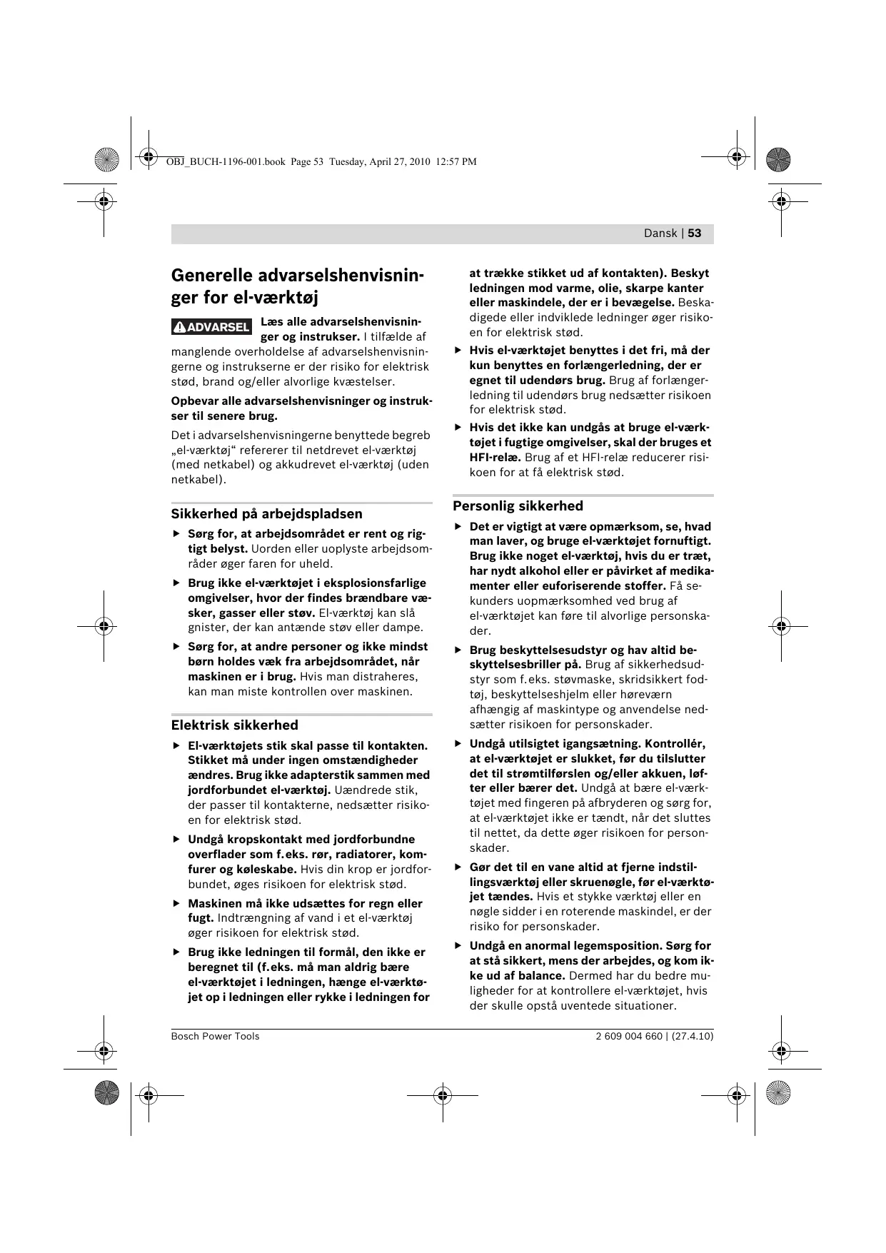 – Veillez à bien aérer la zone de travail. – Il est recommandé de porter un masque respiratoire avec un niveau de filtration de classe P2. Respectez les règlements spécifiques aux matériaux à traiter en vigueur dans votre pays. 2 609 004 660 | (27.4.10)