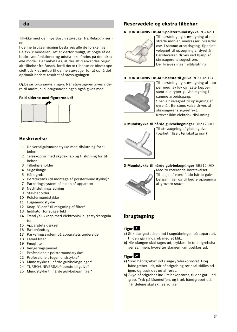 Tillykke med den nye Bosch støvsuger fra Relaxx´x serien. I denne brugsanvisning beskrives alle de forskellige Relaxx´x-modeller. Det er derfor muligt, at nogle af de beskrevne funktioner og udstyr ikke findes på den aktuelle model. Det anbefales, at der altid anvendes originalt tilbehør fra Bosch, fordi dette tilbehør er blevet specielt udviklet netop til denne støvsuger for at opnå det optimalt bedste resultat af støvsugningen. Opbevar brugsanvisningen. Når støvsugeren gives videre til andre, skal brugsanvisningen også gives med. Fold siderne med figurerne ud! Reservedele og ekstra tilbehør A TURBO-UNIVERSAL®-polstermundstykke BBZ42TB Til børstning og støvsugning af polstrede møbler, madrasser, bilsæder osv. i samme arbejdsgang. Specielt velegnet til opsugning af dyrehår. Børstevalsen drives ved hjælp af støvsugerens sugestrøm. Der kræves ingen eltilslutning. B TURBO-UNIVERSAL®-børste til gulve BBZ102TBB Til børstning og støvsugning af tæpper med lav luv og faste tæpper samt alle typer gulvbelægning i samme arbejdsgang. Specielt velegnet til opsugning af dyrehår. Børstens valse drives af støvsugerens sugeeffekt. Kræver ikke elektrisk tilslutning. C Mundstykke til hårde gulvbelægninger BBZ123HD Til støvsugning af glatte gulve (parket, fliser, terrakotta osv.) Beskrivelse 1 Universalgulvmundstykke med tilslutning for tilbehør 2 Teleskoprør med skydeknap og tilslutning for tilbehør 3 Tilbehørsholder 4 Sugeslange 5 Håndgreb 6 Børstekrans (til montage af polstermundstykke)* 7 Parkeringssystem på siden af apparatet 8 Nettilslutningsledning 9 Støvbeholder 10 Polstermundstykke 11 Fugemundstykke 12 Knap "Clean" til rengøring af filter* 13 Indikator for sugeeffekt 14 Tænd-/slukknap med elektronisk sugestyrkeregulator 15 Apparatets dæksel 16 Bærehåndtag 17 Parkeringssystem på apparatets underside 18 Lamel-filter 19 Fnugfilter 20 Rengøringspensel 21 Professionelt polstermundstykke* 22 Professionelt fugemundstykke* 23 Mundstykke til hårde gulvbelægninger* 24 TURBO-UNIVERSAL®-børste til gulve* 25 Mundstykke til hårde gulvbelægninger* D Mundstykke til hårde gulvbelægninger BBZ124HD Med to roterende børstevalser Til pleje af værdifulde hårde gulvbelægninger og til bedre opsugning af grovere snavs. Ibrugtagning Figur 1 a) Stik slangestudsen ind i sugeåbningen på apparatet, til den går i indgreb med et klik. b) Når slangen skal tages ud, trykkes de to indgrebshager sammen, hvorefter slangen kan trækkes ud. Figur 2* a) Skyd håndgrebet ind i suge-/teleskoprøret. Drej håndgrebet lidt, når håndgreb og rør skal skilles ad igen, og træk det ud af røret. b) Skyd håndgrebet ind i teleskoprøret, til det går i indgreb. Tryk på låsemuffen, og træk håndgrebet ud, når delene skal skilles ad igen.