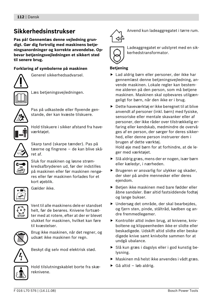 Forklaring af symbolerne på maskinen Generel sikkerhedsadvarsel. Læs betjeningsvejledningen. Pas på udkastede eller flyvende genstande, der kan kvæste tilskuere. Hold tilskuere i sikker afstand fra haveværktøjet. Skarp tand (skarpe tænder). Pas på tæerne og fingrene – de kan blive skåret af. Sluk for maskinen og løsne strømkredsafbryderen ud, før der indstilles på maskinen eller før maskinen rengøres eller før maskinen forlades for et kort øjeblik. STOP Betjening f Lad aldrig børn eller personer, der ikke har gennemlæst denne betjeningsvejledning, anvende maskinen. Lokale regler kan bestemme alderen på den person, som må betjene maskinen. Maskinen skal opbevares utilgængeligt for børn, når den ikke er i brug. f Dette haveværktøj er ikke beregnet til at blive anvendt af personer (inkl. børn) med fysiske, sensoriske eller mentale skavanker eller af personer, der ikke råder over tilstrækkelig erfaring eller kendskab, medmindre de overvåges af en person, der sørger for deres sikkerhed, eller denne person instruerer dem i brugen af dette værktøj. Hold øje med børn for at forhindre, at de leger med værktøjet. f Slå aldrig græs, mens der er nogen, især børn eller kæledyr, i nærheden. f Brugeren er ansvarlig for ulykker og skader, der sker på andre mennesker eller deres ejendom. Gælder ikke. f Betjen ikke maskinen med bare fødder eller åbne sandaler. Bær altid fastsiddende fodtøj og lange bukser. Vent til alle maskinens dele er standset helt, før de berøres. Knivene fortsætter med at rotere, efter at der er blevet slukket for maskinen, hvilket kan føre til kvæstelser. f Undersøg det område, der skal bearbejdes, og fjern sten, pinde, ståltråd, kødben og andre fremmedlegemer. Brug ikke maskinen, når det regner, og udsæt ikke maskinen for regn. Beskyt dig selv mod elektrisk stød. f Kontrollér altid inden brug, at knivene, knivboltene og klippeenheden ikke er slidte eller beskadigede. Udskift altid slidte eller beskadigede knive samt knivbolte sammen for at undgå ubalance. f Slå kun græs i dagslys eller i god kunstig belysning. f Maskinen må helst ikke anvendes i vådt græs. Hold tilslutningskablet borte fra skæreknivene. F 016 L70 576 | (14.11.08) f Gå altid – løb aldrig. Bosch Power Tools Dansk | 113 f Brug aldrig maskinen med defekte beskyttelsesanordninger, afdækninger eller uden sikkerhedsudstyr som f.eks. udkastningsskærm og/eller græsboks. – hvis maskinen begynder at vibrere unormalt meget (kontroller omgående). f Det kan være farligt at arbejde på skråninger: f Kontroller, at alle møtrikker, bolte og skruer sidder rigtigt, så maskinens arbejdstilstand er sikret. – Slå aldrig græs på alt for stejle skråninger. – Man skal altid passe på ikke at miste fodfæstet på skråninger eller vådt græs. – Slå altid græs på tværs af skråninger – aldrig op og ned. – Vær altid meget forsigtig, når du vender. f Vær altid meget forsigtig, når maskinen kører tilbage eller trækkes. f Skub altid maskinen frem under græsslåningen og træk den aldrig hen mod kroppen. f Knivene skal stå stille, når maskinen vippes til transport, når der køres hen over andre overflader end græs og ved transport af maskinen til og fra det område, hvor plænen skal slås. f Vip ikke maskinen ved start eller når motoren startes, medmindre dette er nødvendigt for at starte maskinen i højt græs. I dette tilfælde hæves den side af maskinen, som vender bort fra brugeren, ved at trykke håndgrebet ned. Maskinen må ikke hæves mere end nødvendigt. Sørg for, at begge hænder er på grebet, når maskinen sænkes ned igen. f Tænd for maskinen som beskrevet i driftsvejledningen og sørg for, at dine fødder er tilstrækkeligt langt væk fra roterende dele. f Anbring ikke hænder eller fødder i nærheden af eller under roterende dele. f Hold afstand til udkastningszonen, når du arbejder med maskinen. f Løft eller bær aldrig maskinen, når motoren kører. Strømkredsafbryder løsnes: – før man fjerner sig fra maskinen, – inden man fjerner en blokering, – før man kontrollerer, rengør eller arbejder på maskinen, – efter at man har ramt et fremmedlegeme. Kontroller straks maskinen for beskadigelser og få dem repareret, hvis det er nødvendigt, Bosch Power Tools Vedligeholdelse f Kontrollér græsboksens tilstand og slidniveau med regelmæssige mellemrum. f Kontroller maskinen og erstat for en sikkerheds skyld slidte eller beskadigede dele. f Brug udelukkende de specielle knive til maskinen. f Sørg for kun at montere reservedele, der er godkendt af Bosch. f Brug altid havehandsker, hvis du håndterer eller arbejder i nærheden af skarpe knive. Henvisninger til optimal håndtering af akkuen f Kontrollér, at haveværktøjet er slukket, inden akku’en sættes i. Det kan være farligt at sætte en akku i et haveværktøj, der er tændt. f Ladeaggregatet må ikke udsættes for regn eller fugtighed. Indtrængning af vand i ladeaggregatet øger risikoen for elektrisk stød. f Oplad kun akku’er i ladeaggregater, der er anbefalet af fabrikanten. Et ladeaggregat, der er egnet til en bestemt type batterier, må ikke benyttes med andre batterier - brandfare. f Lad ikke fremmede akkuer. Ladeaggregatet er kun beregnet til ladning af Bosch Li-ion-akkuer med de spændinger, der er angivet i de tekniske data. Ellers er der fare for brand og eksplosion. f Renhold ladeaggregatet. Snavs øger faren for elektrisk stød. f Kontrollér ladeaggregat, kabel og stik før brug. Anvend ikke ladeaggregatet, hvis det er beskadiget. Forsøg ikke at åbne ladeaggregatet og sørg for at det repareres af kvalificerede fagfolk, og at der kun benyttes originale reservedele. Beskadigede ladeaggregater, kabler og stik øger risikoen for elektrisk stød. F 016 L70 576 | (14.11.08) 114 | Dansk f Anvend ikke ladeaggregatet på let brændbar undergrund (f.eks. papir, tekstiler osv.) eller i brændbare omgivelser. Pas på! Ladeaggregatet bl