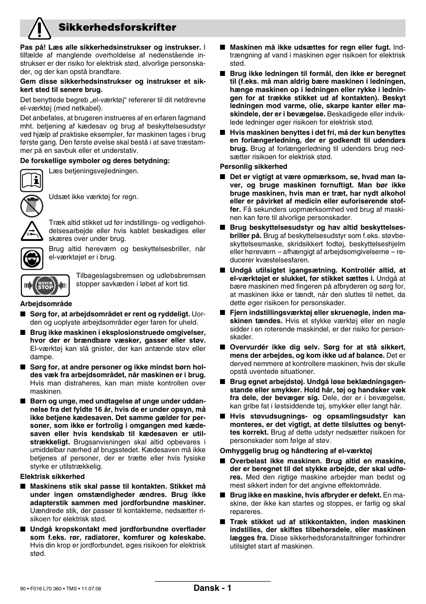 Prova di omologazione num. 2088141.01 CE attraverso stazione di collaudo notificata num. 0344. CE 2000/14: Il livello della potenza sonora L WA garantito è minore di 104 dB (A). Procedimento di valutazione della conformità secondo appendice V. Leinfelden, 01.09.2005. Dr. Egbert Schneider Als u de machine wilt uitschakelen, laat u de aan/ uit-schakelaar 2 los. Na het zagen mag de kettingzaag niet worden gestopt door het bedienen van de voorste handbescherming (activeren van de terugslagrem).