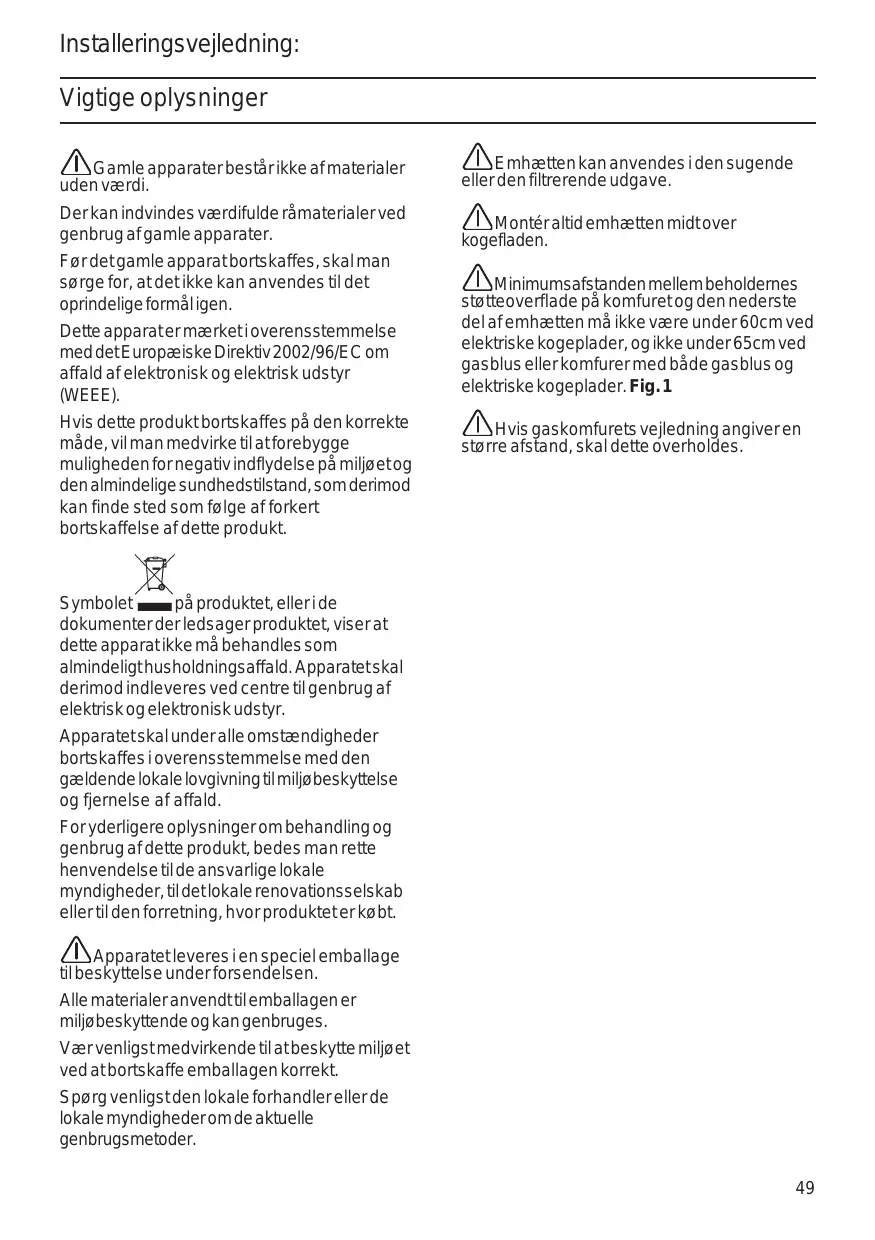 Installeringsvejledning: Vigtige oplysninger Gamle apparater består ikke af materialer uden værdi. Emhætten kan anvendes i den sugende eller den filtrerende udgave. Der kan indvindes værdifulde råmaterialer ved genbrug af gamle apparater. Montér altid emhætten midt over kogefladen. Før det gamle apparat bortskaffes, skal man sørge for, at det ikke kan anvendes til det oprindelige formål igen. Dette apparat er mærket i overensstemmelse med det Europæiske Direktiv 2002/96/EC om affald af elektronisk og elektrisk udstyr (WEEE). Hvis dette produkt bortskaffes på den korrekte måde, vil man medvirke til at forebygge muligheden for negativ indflydelse på miljøet og den almindelige sundhedstilstand, som derimod kan finde sted som følge af forkert bortskaffelse af dette produkt. Minimumsafstanden mellem beholdernes støtteoverflade på komfuret og den nederste del af emhætten må ikke være under 60cm ved elektriske kogeplader, og ikke under 65cm ved gasblus eller komfurer med både gasblus og elektriske kogeplader. Fig. 1 Hvis gaskomfurets vejledning angiver en større afstand, skal dette overholdes. Symbolet på produktet, eller i de dokumenter der ledsager produktet, viser at dette apparat ikke må behandles som almindeligt husholdningsaffald. Apparatet skal derimod indleveres ved centre til genbrug af elektrisk og elektronisk udstyr. Apparatet skal under alle omstændigheder bortskaffes i overensstemmelse med den gældende lokale lovgivning til miljøbeskyttelse og fjernelse af affald. For yderligere oplysninger om behandling og genbrug af dette produkt, bedes man rette henvendelse til de ansvarlige lokale myndigheder, til det lokale renovationsselskab eller til den forretning, hvor produktet er købt. Apparatet leveres i en speciel emballage til beskyttelse under forsendelsen. Alle materialer anvendt til emballagen er miljøbeskyttende og kan genbruges. Vær venligst medvirkende til at beskytte miljøet ved at bortskaffe emballagen korrekt. Spørg venligst den lokale forhandler eller de lokale myndigheder om de aktuelle genbrugsmetoder.
