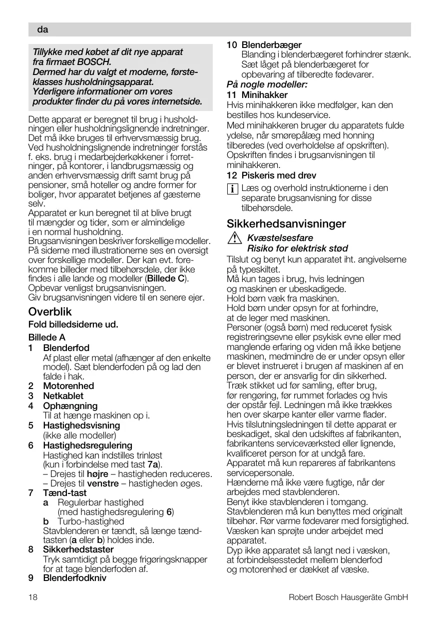 Sikkerhedsanvisninger hî‹ëíÉäëÉëÑ~êÉ oáëáâç=Ñçê=ÉäÉâíêáëâ=ëí›Ç Tilslut og benyt kun apparatet iht. angivelserne på typeskiltet. Må kun tages i brug, hvis ledningen og maskinen er ubeskadigede. Hold børn væk fra maskinen. Hold børn under opsyn for at forhindre, at de leger med maskinen. Personer (også børn) med reduceret fysisk registreringsevne eller psykisk evne eller med manglende erfaring og viden må ikke betjene maskinen, medmindre de er under opsyn eller er blevet instrueret i brugen af maskinen af en person, der er ansvarlig for din sikkerhed. Træk stikket ud før samling, efter brug, før rengøring, før rummet forlades og hvis der opstår fejl. Ledningen må ikke trækkes hen over skarpe kanter eller varme flader. Hvis tilslutningsledningen til dette apparat er beskadiget, skal den udskiftes af fabrikanten, fabrikantens serviceværksted eller lignende, kvalificeret person for at undgå fare. Apparatet må kun repareres af fabrikantens servicepersonale. Hænderne må ikke være fugtige, når der arbejdes med stavblenderen. Benyt ikke stavblenderen i tomgang. Stavblenderen må kun benyttes med originalt tilbehør. Rør varme fødevarer med forsigtighed. Væsken kan sprøjte under arbejdet med apparatet. Dyp ikke apparatet så langt ned i væsken, at forbindelsesstedet mellem blenderfod og motorenhed er dækket af væske. Robert Bosch Hausgeräte GmbH