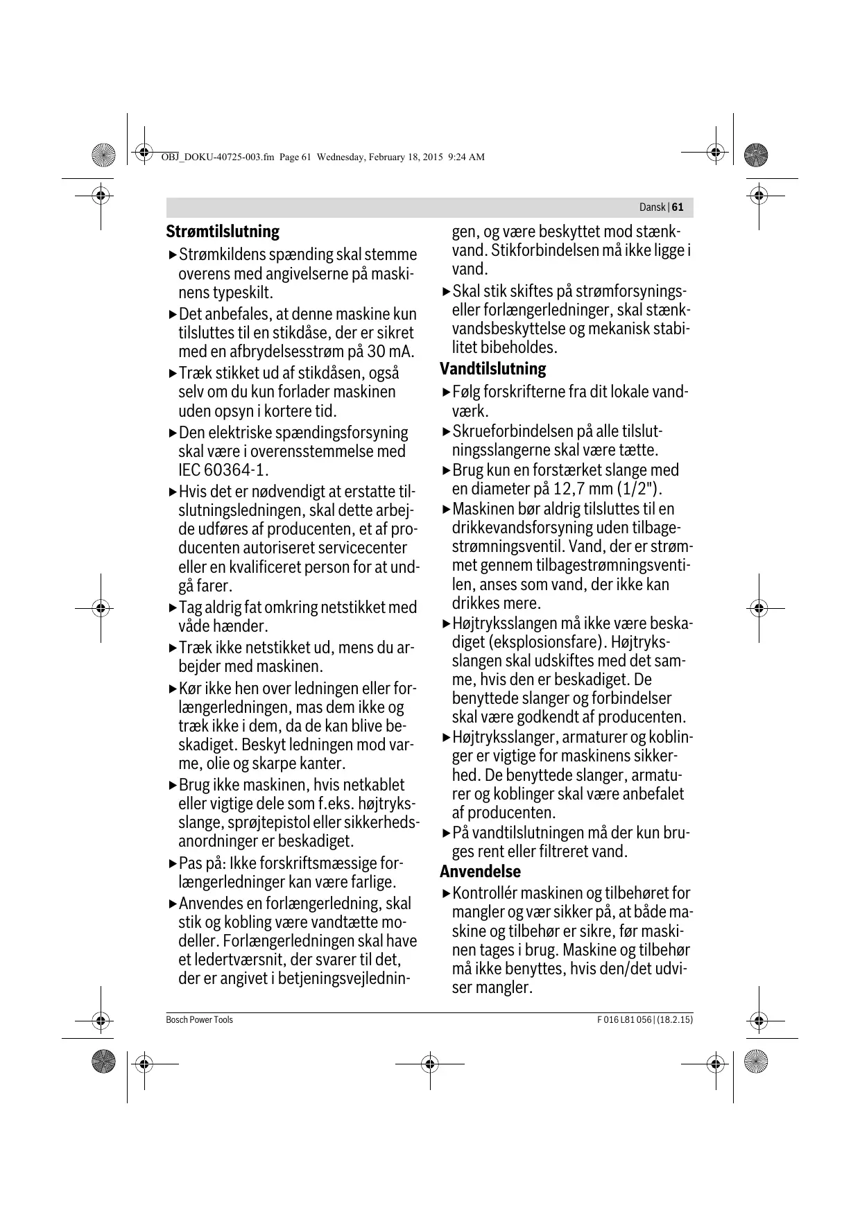 6,8 Indkoblingsstrømstødet kan forårsage kortfristede spændingsfald. Under ugunstige netbetingelser i tyndtbefolket område kan andre apparater blive påvirket heraf. Hvis strømtilførslens systemimpedans er mindre end 0,153 Ohm, er det usandsynligt, at der opstår ulemper. Bosch Power Tools F 016 L81 056 | (18.2.15) OBJ_DOKU-40725-003.fm Page 64 Wednesday, February 18, 2015 9:24 AM 64 | Dansk Højtryksrenser Maksimalt indgangstryk Autostop-funktion Vægt svarer til EPTA-Procedure 01/2003 Beskyttelsesklasse Serienummer AQT 42-13