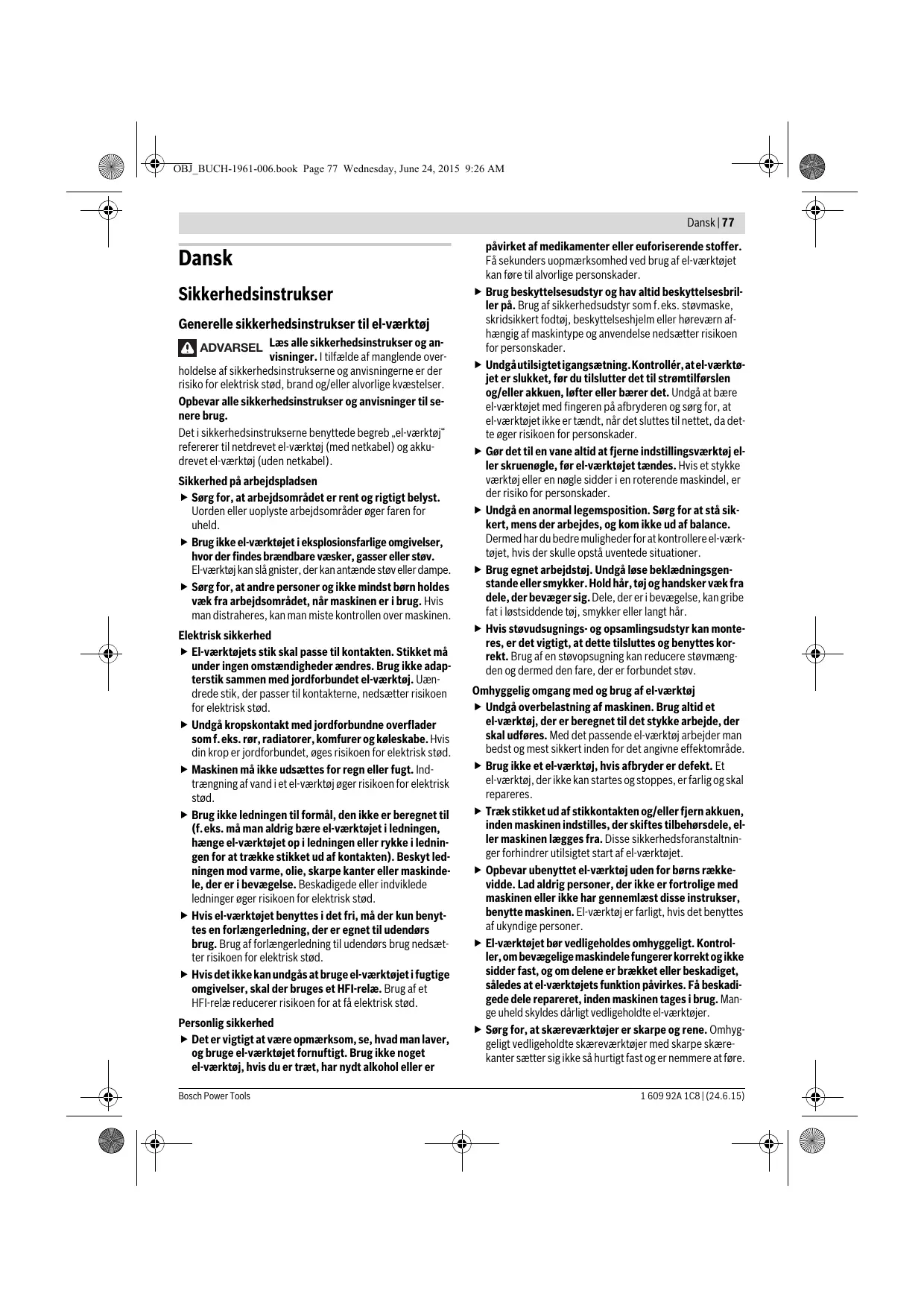 Lamellenschijven hebben een aanzienlijk langere levensduur, een lager geluidsniveau en lagere slijptemperaturen dan traditionele slijpschijven. Metaal doorslijpen Gebruik bij doorslijpwerkzaamheden met gebonden slijpmiddelen altijd de beschermkap voor doorslijpen Werk bij het doorslijpen met een matige voorwaartse beweging, aangepast aan het te bewerken materiaal. Oefen geen druk op de doorslijpschijf uit, houdt deze niet schuin en laat de schijf niet oscilleren. Rem uitlopende doorslijpschijven niet af door er aan de zijkant tegen te drukken. Met het elektrische gereedschap moet altijd tegenlopend worden geslepen. Anders bestaat het gevaar dat de machine ongecontroleerd uit de zaaglijn wordt geduwd. Profielen en vierkantbuizen kunt u het best bij de kleinste diameter doorslijpen. 1 609 92A 1C8 | (24.6.15) OBJ_BUCH-1961-006.book Page 76 Wednesday, June 24, 2015 9:26 AM 76 | Nederlands Steen doorslijpen Zorg bij doorslijpwerkzaamheden in steen voor een voldoende stofafzuiging. Draag een stofmasker. Het elektrische gereedschap mag alleen worden gebruik voor droog doorslijpen en droog schuren. Gebruik voor het doorslijpen van steen bij voorkeur een diamantdoorslijpschijf. Bij gebruik van de afzuigkap voor doorslijpen met de geleidingsslede 19 moet de stofzuiger voor het afzuigen van steenstof goedgekeurd zijn. Bosch levert geschikte stofzuigers. Schakel het elektrische gereedschap in en plaats het met het voorste deel van de geleideslede op het werkstuk. Duw het elektrische gereedschap verder met een matige voorwaartse beweging, aangepast aan het te bewerken materiaal. Bij het doorslijpen van bijzonder harde materialen, bijvoorbeeld beton met veel kiezel, kan de diamantdoorslijpschijf oververhit raken en daardoor beschadigd worden. Een krans van vonken rond de diamantdoorslijpschijf geeft dit duidelijk aan. Onderbreek in dit geval het doorslijpen en laat de diamantdoorslijpschijf bij maximaal toerental korte tijd onbelast lopen om deze te laten afkoelen. Een duidelijk verminderde werksnelheid en een krans van vonken rond de slijpschijf duiden op een stomp geworden diamantdoorslijpschijf. U kunt deze weer scherp maken door kort te slijpen in abrasief materiaal, bijvoorbeeld kalkzandsteen. Bouwkundige aspecten Voor sleuven in dragende muren geldt norm DIN 1053 deel 1 of gelden landspecifieke bepalingen. Deze voorschriften moeten beslist in acht worden genomen. Raadpleeg voor het begin van de werkzaamheden de verantwoordelijke bouwkundige, architect of met de leiding belaste bouwopzichter. Onderhoud en service Onderhoud en reiniging Trek altijd voor werkzaamheden aan het elektrische gereedschap de stekker uit het stopcontact. Houd het elektrische gereedschap en de ventilatieopeningen altijd schoon om goed en veilig te werken. 1 609 92A 1C8 | (24.6.15) Gebruik onder extreme gebruiksomstandigheden indien mogelijk altijd een afzuiginstallatie. Blaas de ventilatieopeningen regelmatig schoon en sluit het gereedschap via een aardlekschakelaar (PRCD) aan. Tijdens het bewerken van metalen kan geleidend stof in het elektrische gereedschap terechtkomen. Daardoor kan de veiligheidsisolatie van het elektrische gereedschap worden geschaad. Bewaar en behandel het toebehoren zorgvuldig. Als de aansluitkabel moet worden vervangen, moeten deze werkzaamheden door Bosch of een erkende klantenservice voor Bosch elektrische gereedschappen worden uitgevoerd om veiligheidsrisico’s te voorkomen. Klantenservice en gebruiksadviezen Onze klantenservice beantwoordt uw vragen over reparatie en onderhoud van uw product en over vervangingsonderdelen. Explosietekeningen en informatie over vervangingsonderdelen vindt u ook op: www.bosch-pt.com Het Bosch-team voor gebruiksadviezen helpt u graag bij vragen over onze producten en toebehoren. Vermeld bij vragen en bestellingen van vervangingsonderdelen altijd het uit tien cijfers bestaande productnummer volgens het typeplaatje van het product. Nederland Tel.: (076) 579 54 54 Fax: (076) 579 54 94 E-mail: gereedschappen@nl.bosch.com België Tel.: (02) 588 0589 Fax: (02) 588 0595 E-mail: outillage.gereedschap@be.bosch.com Afvalverwijdering Elektrische gereedschappen, toebehoren en verpakkingen moeten op een voor het milieu verantwoorde wijze worden hergebruikt. Gooi elektrische gereedschappen niet bij het huisvuil. Alleen voor landen van de EU: Volgens de Europese richtlijn 2012/19/EU over elektrische en elektronische oude apparaten en de omzetting van de richtlijn in nationaal recht moeten niet meer bruikbare elektrische gereedschappen apart worden ingezameld en op een voor het milieu verantwoorde wijze worden hergebruikt. Wijzigingen voorbehouden. Bosch Power Tools OBJ_BUCH-1961-006.book Page 77 Wednesday, June 24, 2015 9:26 AM Dansk | 77 Dansk Sikkerhedsinstrukser Generelle sikkerhedsinstrukser til el-værktøj ADVARSEL Læs alle sikkerhedsinstrukser og anvisninger. I tilfælde af manglende overholdelse af sikkerhedsinstrukserne og anvisningerne er der risiko for elektrisk stød, brand og/eller alvorlige kvæstelser. Opbevar alle sikkerhedsinstrukser og anvisninger til senere brug. Det i sikkerhedsinstrukserne benyttede begreb „el-værktøj“ refererer til netdrevet el-værktøj (med netkabel) og akkudrevet el-værktøj (uden netkabel). Sikkerhed på arbejdspladsen Sørg for, at arbejdsområdet er rent og rigtigt belyst. Uorden eller uoplyste arbejdsområder øger faren for uheld. Brug ikke el-værktøjet i eksplosionsfarlige omgivelser, hvor der findes brændbare væsker, gasser eller støv. El-værktøj kan slå gnister, der kan antænde støv eller dampe. Sørg for, at andre personer og ikke mindst børn holdes væk fra arbejdsområdet, når maskinen er i brug. Hvis man distraheres, kan man miste kontrollen over maskinen. Elektrisk sikkerhed El-værktøjets stik skal passe til kontakten. Stikket må under ingen omstændigheder ændres. Brug ikke adapterstik sammen med jordforbundet el-værktøj. Uændrede stik, der passer til kontakterne, nedsætter risikoen for elektrisk