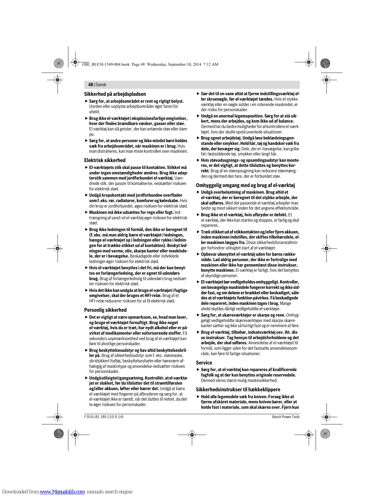 Personlig sikkerhed Det er vigtigt at være opmærksom, se, hvad man laver, og bruge el-værktøjet fornuftigt. Brug ikke noget el-værktøj, hvis du er træt, har nydt alkohol eller er påvirket af medikamenter eller euforiserende stoffer. Få sekunders uopmærksomhed ved brug af el-værktøjet kan føre til alvorlige personskader. Brug beskyttelsesudstyr og hav altid beskyttelsesbriller på. Brug af sikkerhedsudstyr som f.eks. støvmaske, skridsikkert fodtøj, beskyttelseshjelm eller høreværn afhængig af maskintype og anvendelse nedsætter risikoen for personskader. Undgå utilsigtet igangsætning. Kontrollér, at el-værktøjet er slukket, før du tilslutter det til strømtilførslen og/eller akkuen, løfter eller bærer det. Undgå at bære el-værktøjet med fingeren på afbryderen og sørg for, at el-værktøjet ikke er tændt, når det sluttes til nettet, da dette øger risikoen for personskader. F 016 L81 185 | (10.9.14)