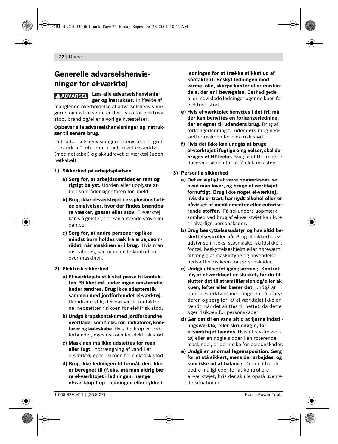 ADVARSEL Læs alle advarselshenvisninger og instrukser. I tilfælde af manglende overholdelse af advarselshenvisningerne og instrukserne er der risiko for elektrisk stød, brand og/eller alvorlige kvæstelser. Opbevar alle advarselshenvisninger og instrukser til senere brug. Det i advarselshenvisningerne benyttede begreb „el-værktøj“ refererer til netdrevet el-værktøj (med netkabel) og akkudrevet el-værktøj (uden netkabel). 1) Sikkerhed på arbejdspladsen a) Sørg for, at arbejdsområdet er rent og rigtigt belyst. Uorden eller uoplyste arbejdsområder øger faren for uheld. b) Brug ikke el-værktøjet i eksplosionsfarlige omgivelser, hvor der findes brændbare væsker, gasser eller støv. El-værktøj kan slå gnister, der kan antænde støv eller dampe. c) Sørg for, at andre personer og ikke mindst børn holdes væk fra arbejdsområdet, når maskinen er i brug. Hvis man distraheres, kan man miste kontrollen over maskinen. 2) Elektrisk sikkerhed a) El-værktøjets stik skal passe til kontakten. Stikket må under ingen omstændigheder ændres. Brug ikke adapterstik sammen med jordforbundet el-værktøj. Uændrede stik, der passer til kontakterne, nedsætter risikoen for elektrisk stød. b) Undgå kropskontakt med jordforbundne overflader som f.eks. rør, radiatorer, komfurer og køleskabe. Hvis din krop er jordforbundet, øges risikoen for elektrisk stød. c) Maskinen må ikke udsættes for regn eller fugt. Indtrængning af vand i et el-værktøj øger risikoen for elektrisk stød. d) Brug ikke ledningen til formål, den ikke er beregnet til (f.eks. må man aldrig bære el-værktøjet i ledningen, hænge el-værktøjet op i ledningen eller rykke i 1 609 929 M11 | (28.9.07)