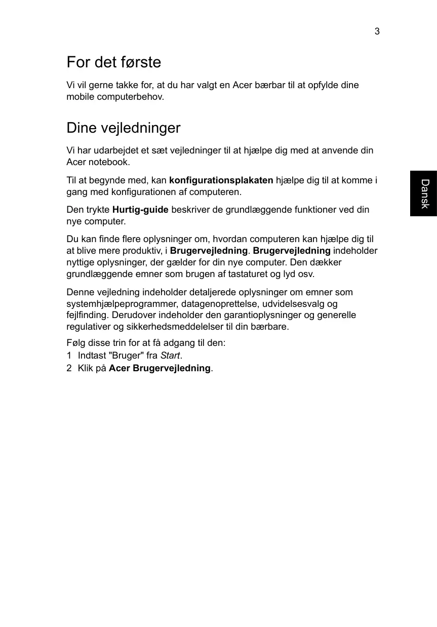 Vi vilGREne takke for, at du har valgt en Acer bærbar til at opfylde dine mobile computerbehov.