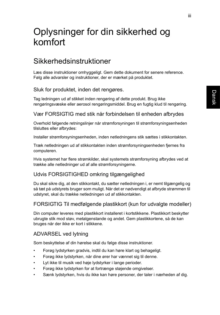 Oplysninger for din sikkerhed og komfort Sikkerhedsinstruktioner Læs disse instruktioner omhyggeligt. Gem dette dokument for senere reference. Følg alle advarsler og instruktioner, der er mærket på produktet.