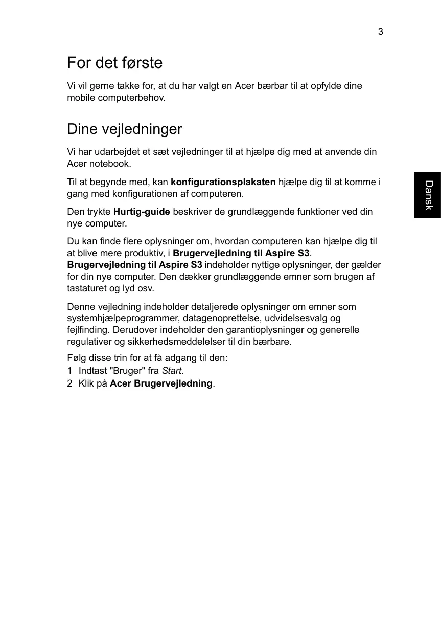 Brugervejledning til Aspire S3 indeholder nyttige oplysninger, der gelder for din nye computer. Den dækker grundlaeggende emner som brugen af tastaturet og lyd osv.