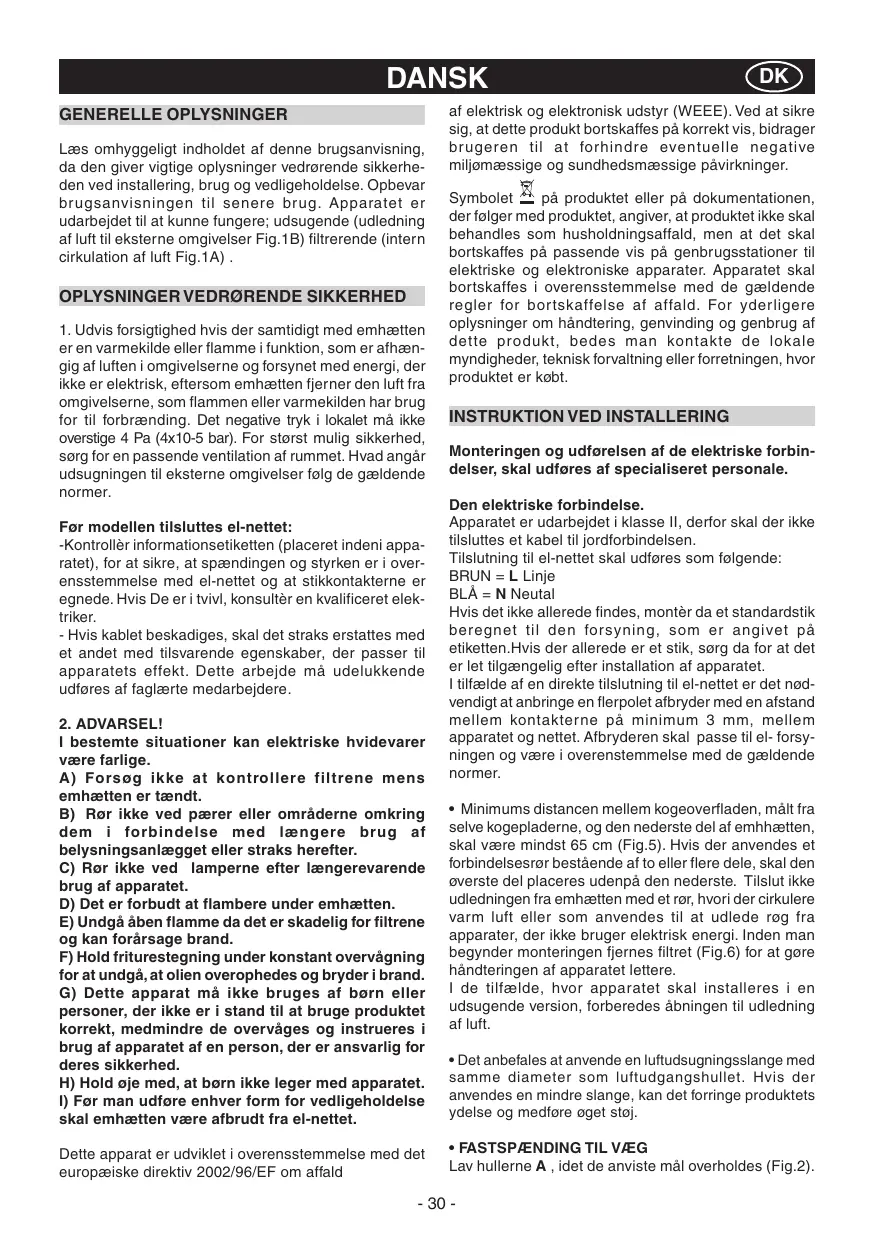 DANSK GENERELLE OPLYSNINGER Læs omhyggeligt indholdet af denne brugsanvisning, da den giver vigtige oplysninger vedrørende sikkerheden ved installering, brug og vedligeholdelse. Opbevar br ugsanvisningen til senere brug. Apparatet er udarbejdet til at kunne fungere; udsugende (udledning af luft til eksterne omgivelser Fig.1B) filtrerende (intern cirkulation af luft Fig.1A) .