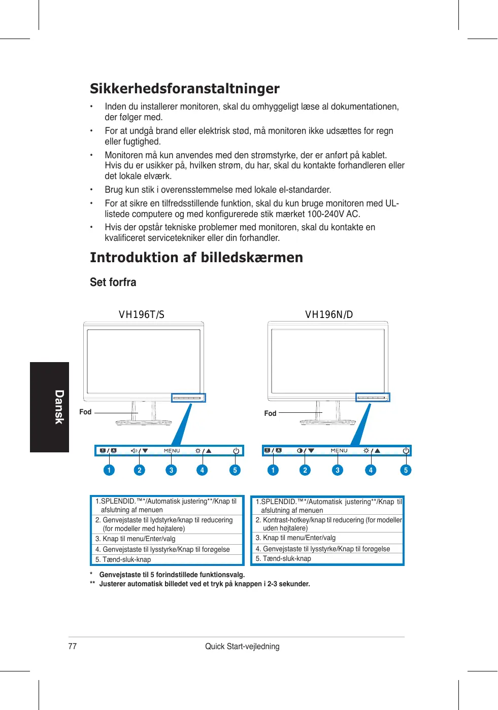 - Genvejstaste til 5 forindstillede funktionsvalg. ** Justerer automatisk billedet ved et tryk på knappen i 2-3 sekunder.